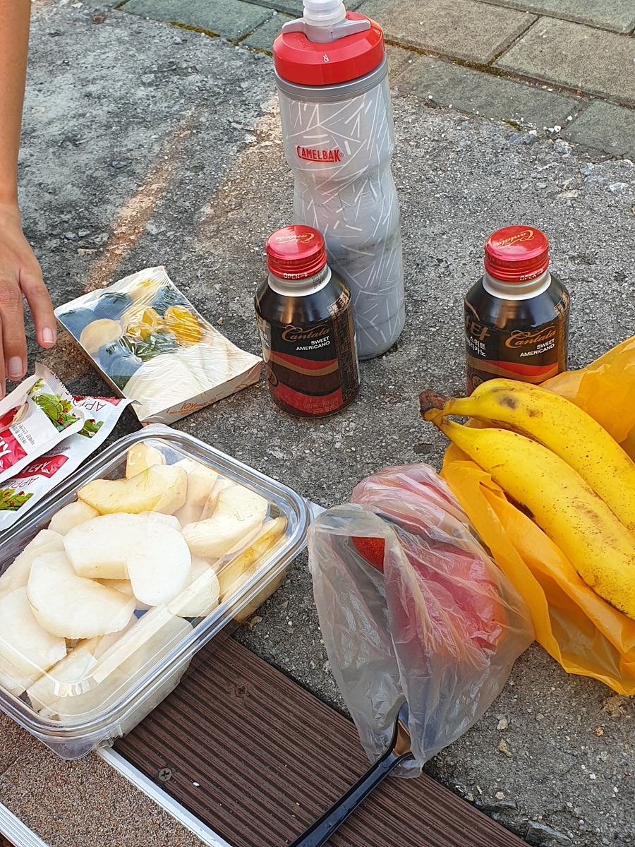 아까 받은 간식을 여기서 펼쳐본다. 과일, 떡, 사과즙에 커피와 바나나까지 푸짐하다. 마침 가게들도 역도 운영을 안 해서 보급이 애매할 뻔했는데 감사히 잘 먹는다.