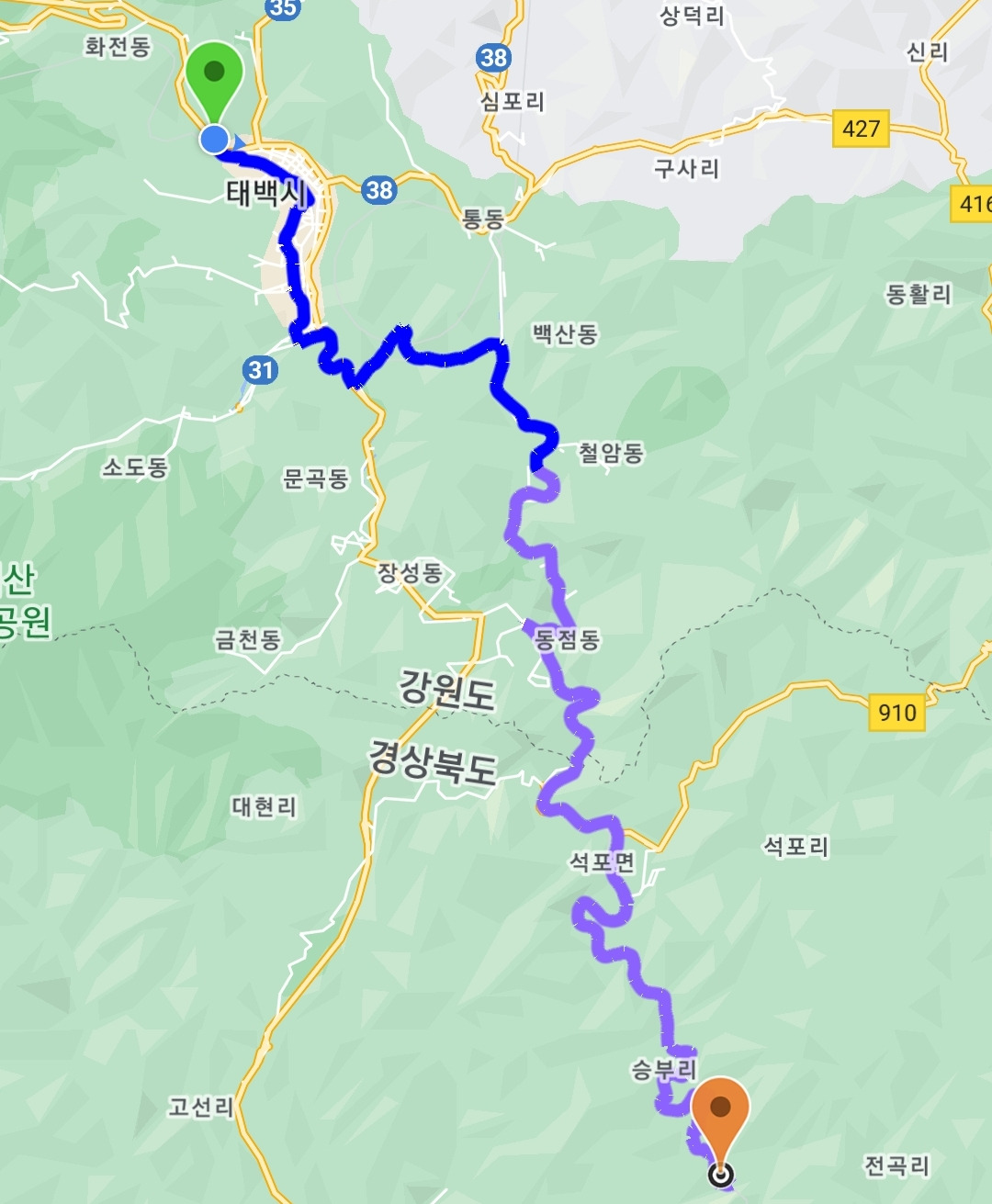 이 31번 국도로 장성까지 가는 건 가능하면 피하고 싶다. 좀 힘들긴 하지만 차 없는 길로 피할 수 있다. 태백 종합운동장 쪽으로 연화산을 넘어가면 된다.