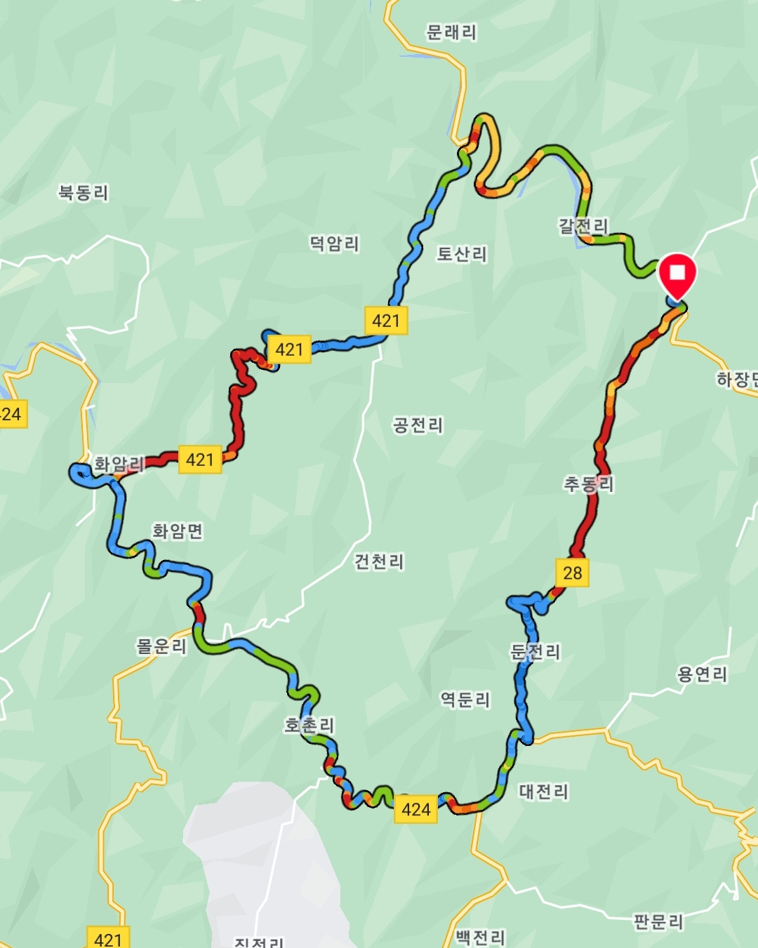 마냥 35번 국도를 따라서 강릉으로 가려는 건 아니기 때문에 중간에 421번 도로로 갈아타야 한다. 피암터널을 지나면 토산삼거리에서 정선, 화암 방면으로 좌회전한다.