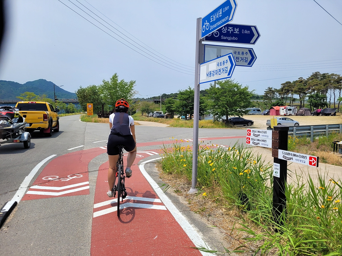 남한강에 강천섬이 있다면 낙동강에는 경천섬이 있다. 자전거길은 차들과 관광객들로 정신없는 경천섬 주차장을 둘러가니 도로로 달리는 쪽이 편하다.