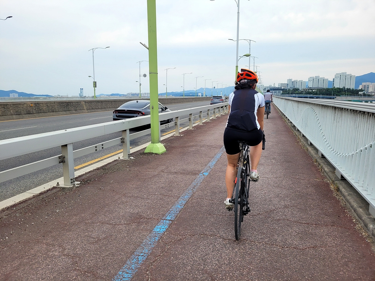 작은 고개를 넘으면 다시 중동교 다리를 건너 우안으로 이어진다. 낙동강 자전거길은 대부분 강 양쪽 중에 한쪽에만 길이 만들어져 있다.