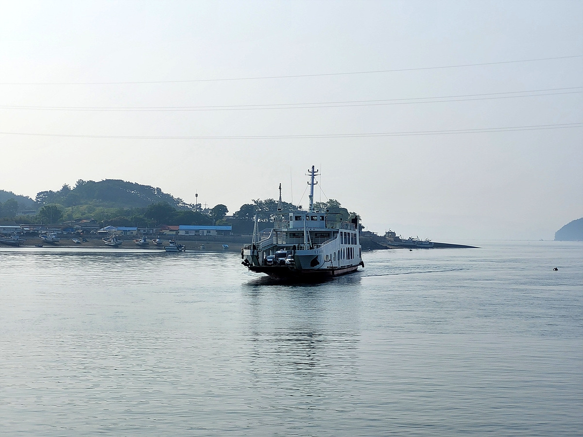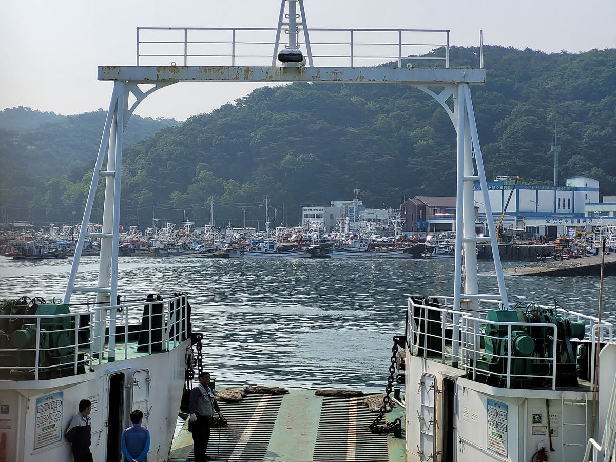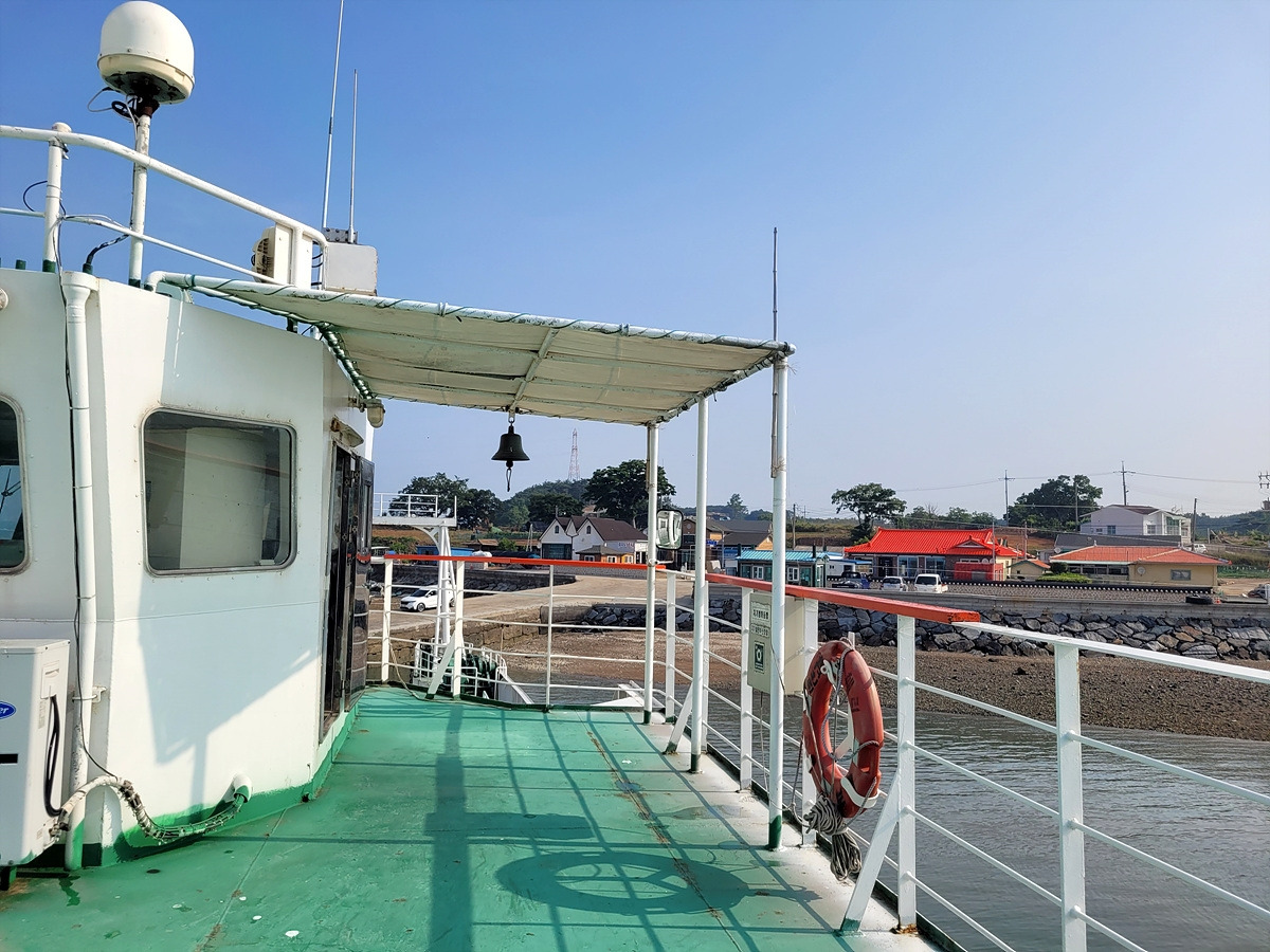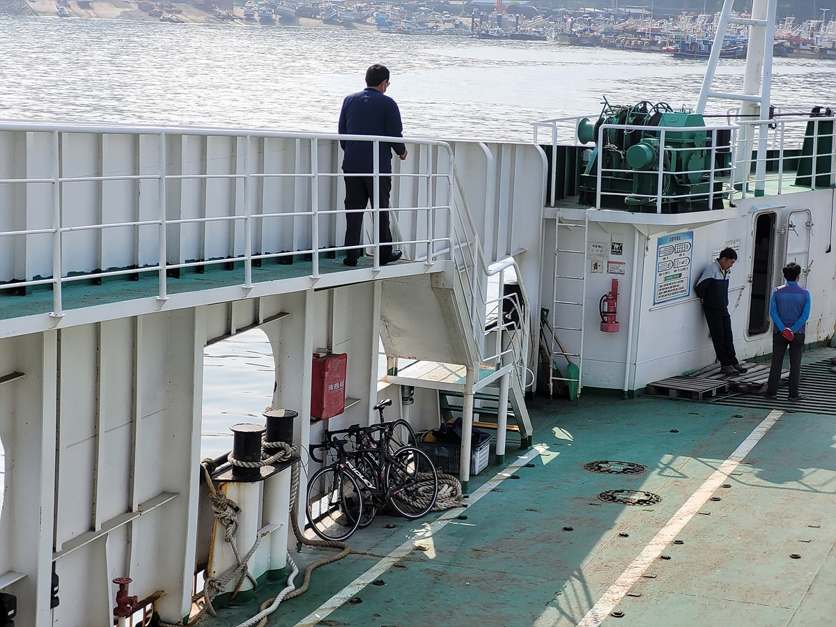 보통 이런 연안여객선에서는 2층 올라가는 계단 바로 뒤쪽이 자전거 놓기 좋다. 자전거를 두고 2층 객실로 올라간다. 배는 도착하자마자 바로 출발한다. 자동차나 짐이 많으면 그만큼 시간이 소요되는데 대부분의 자동차들은 이제 개통된 해저터널을 이용해서 육로로 가기 때문에 배를 거의 이용하지 않는다. 배에 들어온 차량 한 대는 바로 코 앞의 효자도에 가는 차다.