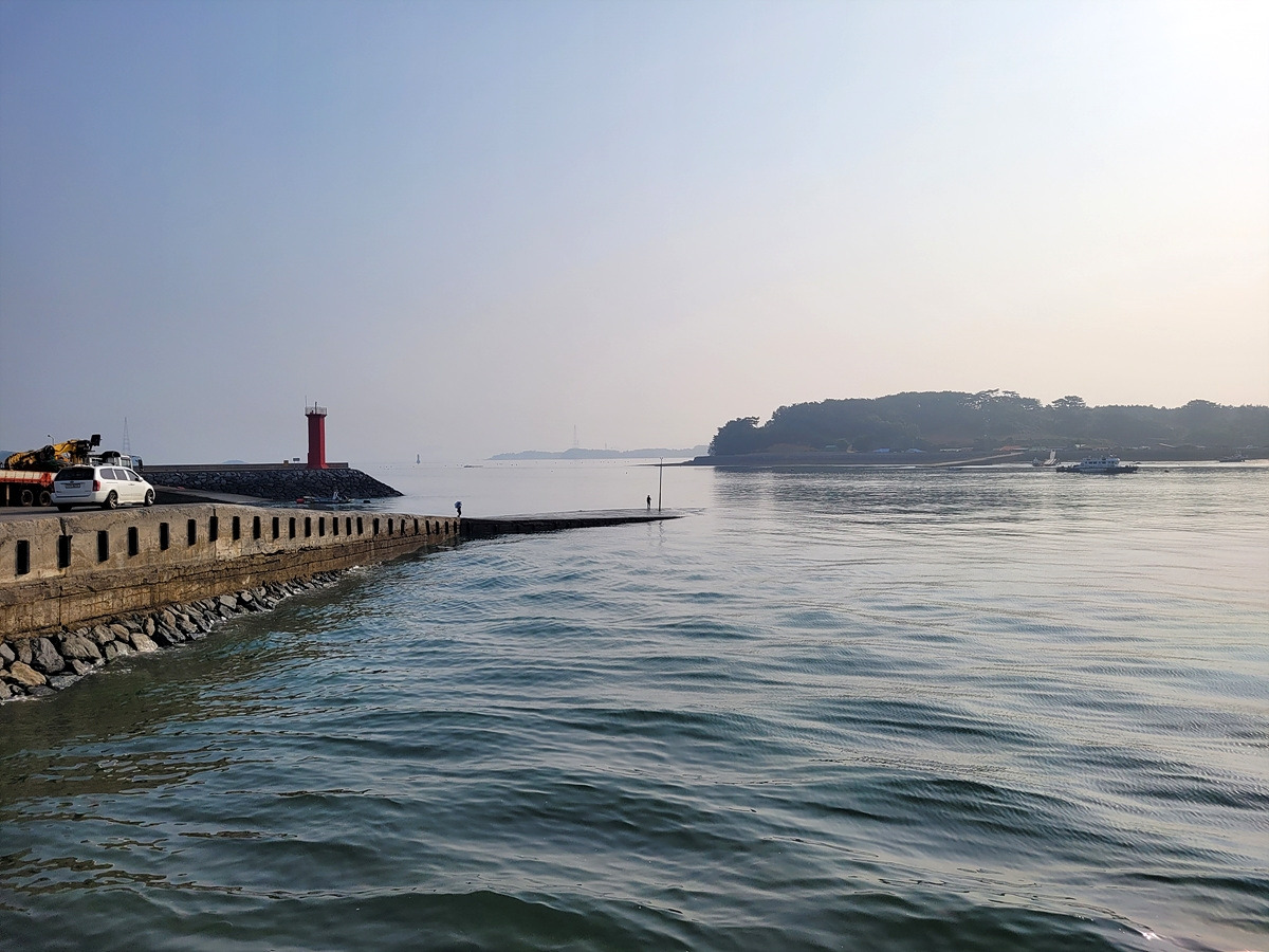 배를 타게 되면 돌이킬 수 없으니 잊어버리는 것 없도록 준비를 한다. 8시 5분쯤 되니 들어오는 배가 보인다. 배 바로 뒤에 보이는 섬이 대천-선촌 항로 중간에 들르는 효자도이다.