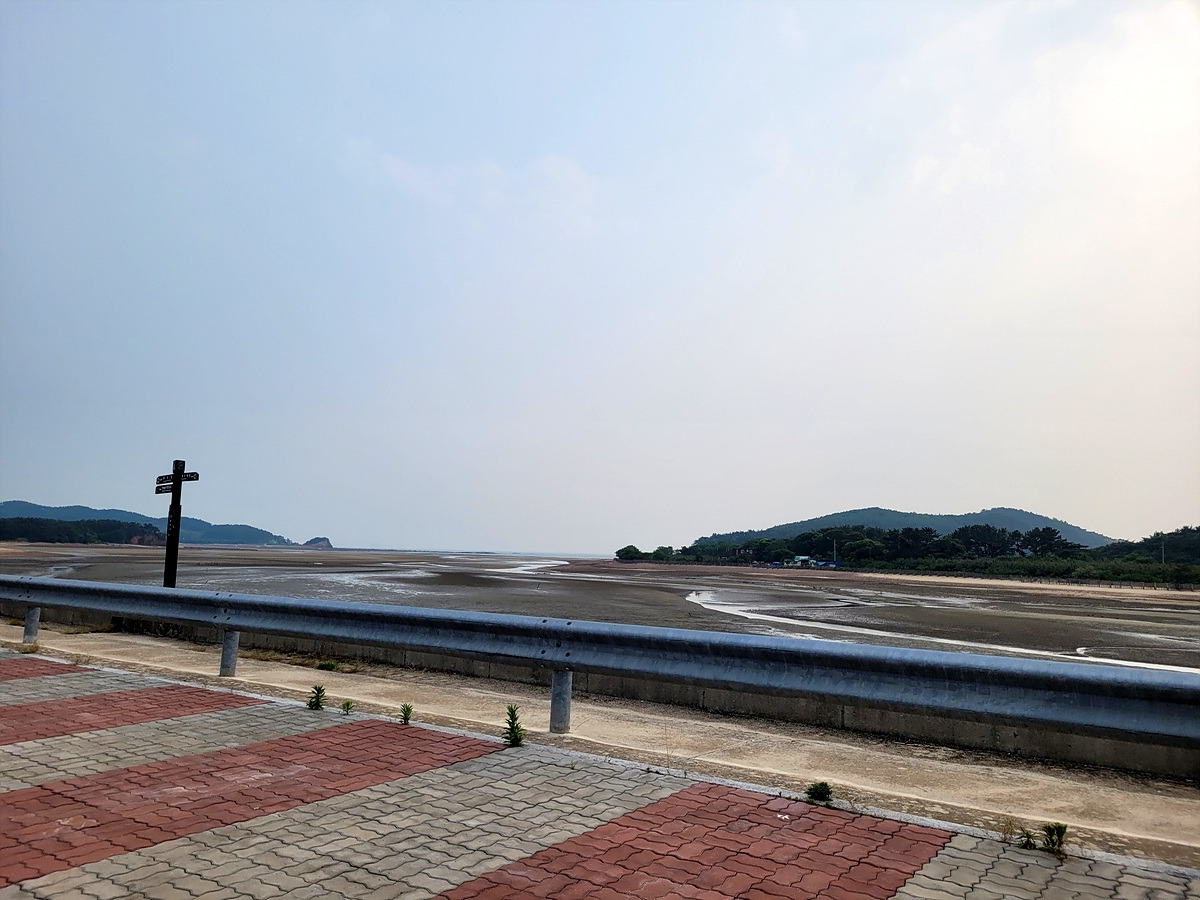 그리고 그 앞 갯벌 사이로 길이 있다. 이 길은 갯벌 작업용을 하기 위해 만든 농기계용 도로로 차량 출입 금지 표지가 있긴 한데... 차들이 계속 왔다 갔다 한다. 여기를 지나지 않으면 보령 시내까지 들어가서 보령 남대천교를 건너야 한다. 우리도 이 지름길을 건넌다. 밀물에는 잠기는 길 같은데 물때가 맞아서 다행이다.