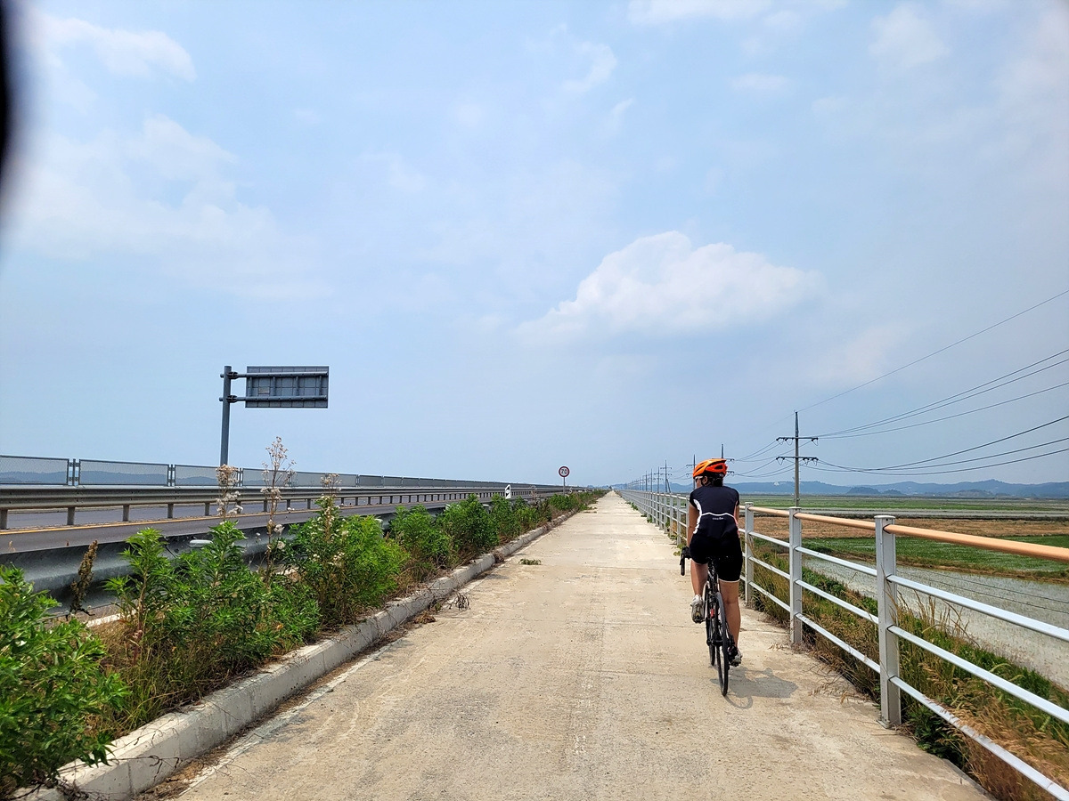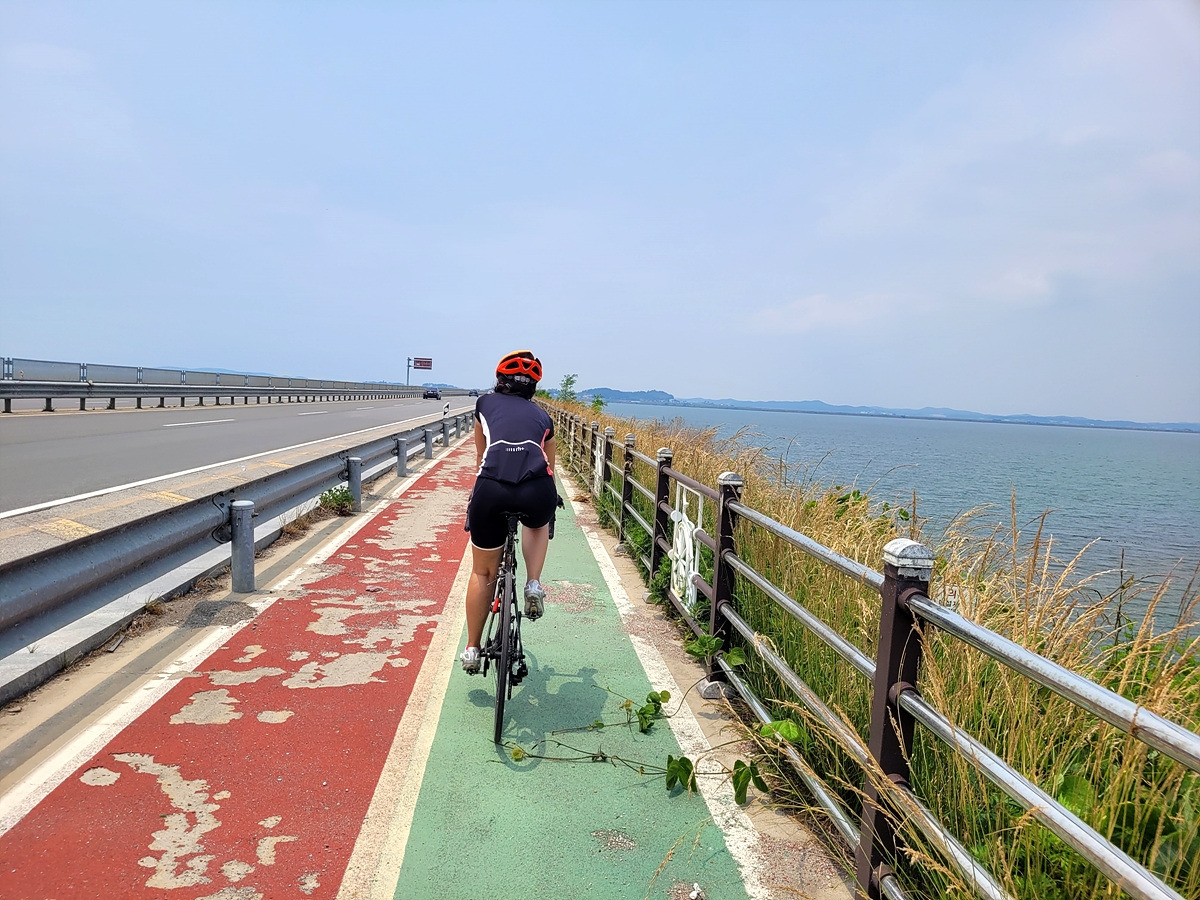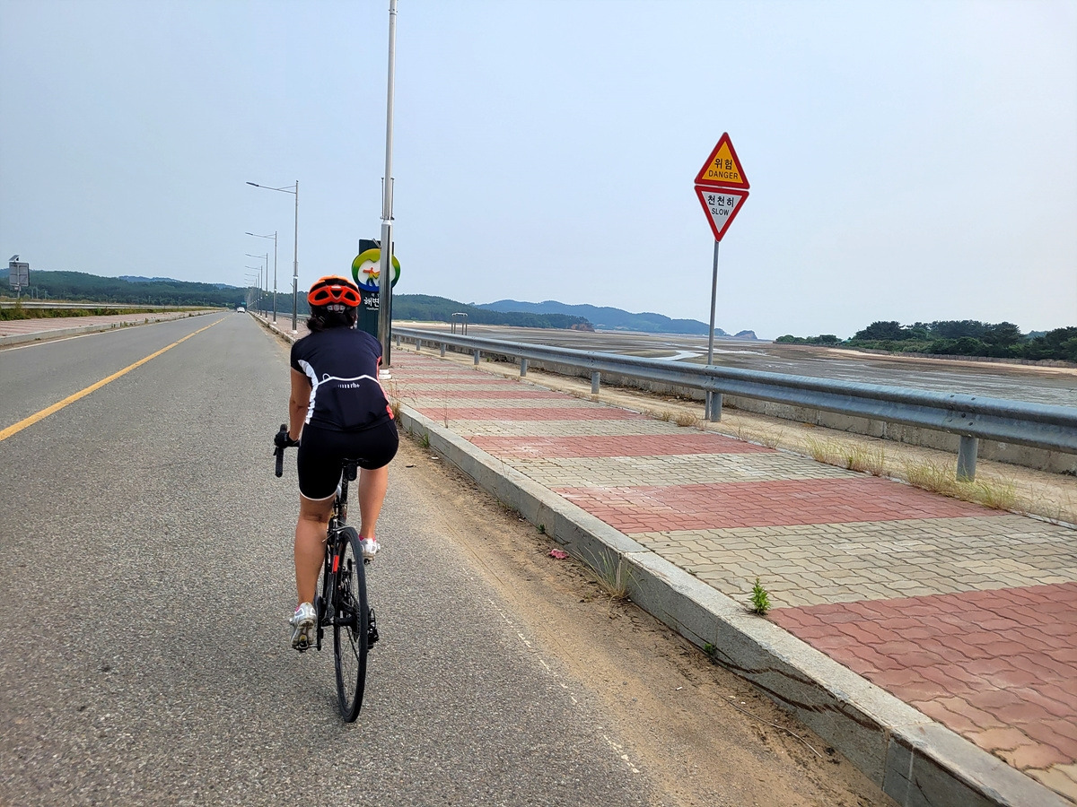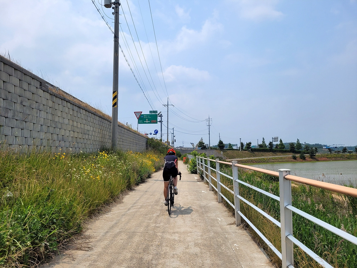 이제부터는 대천방조제길을 따라간다. 자전거길이 있긴 한데 영 상태가 안 좋아서 오히려 위험한 길이다. 차량 통행이 적은 길이니 무리해서 자전거길로 갈 필요는 없는 것 같다.