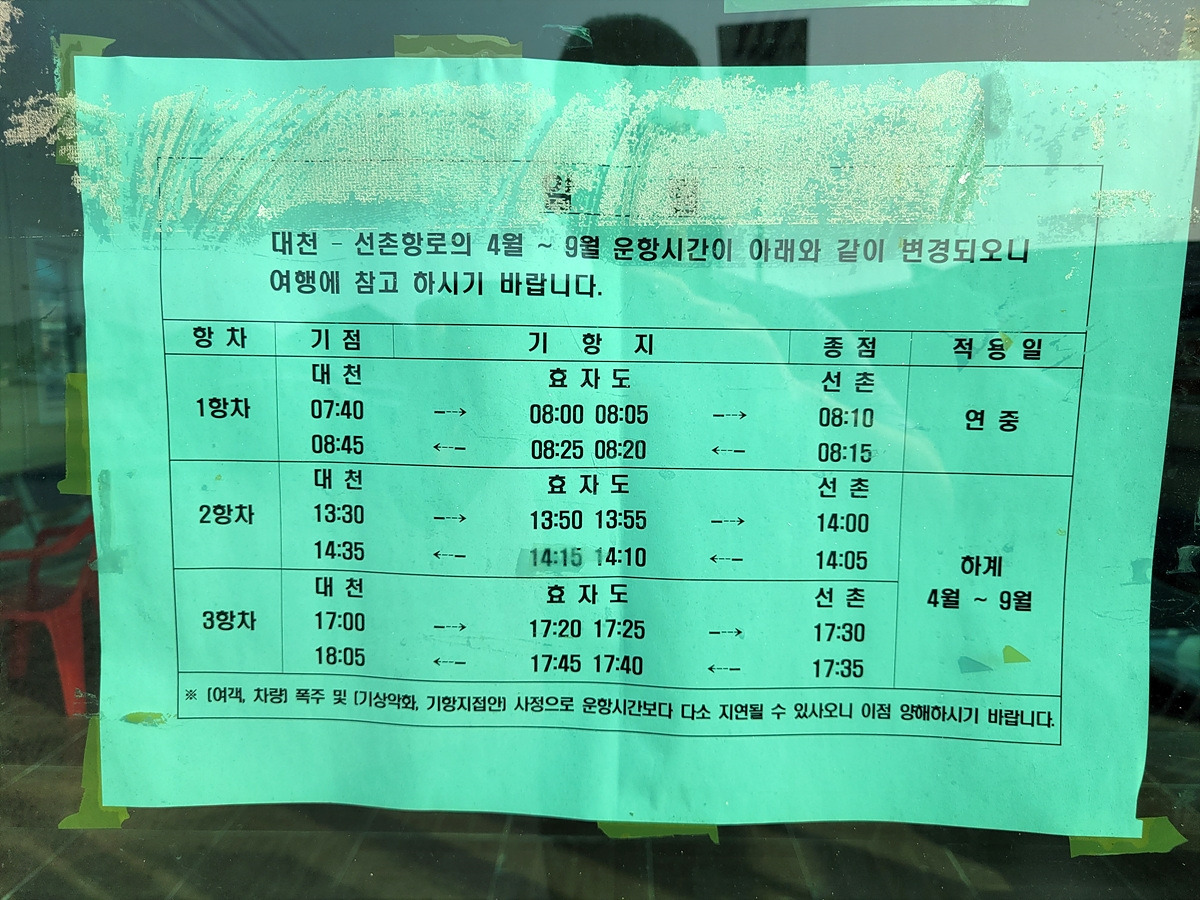선촌항에는 공중 화장실도 있고 여객터미널 대합실도 있다. 미리 검색한 대로 선촌항에서 출발하는 배는 8시 15분이다. 대천항에 주차하고 출발해서 선촌항에서 오후 5시 반 배를 타도 되지만 혹시라도 막배를 놓칠 수 있다고 생각하면 자전거 타는 내내 마음이 조급해지니 미리 배를 먼저 타고 편안하게 달리는 게 속 편한 방법이다.