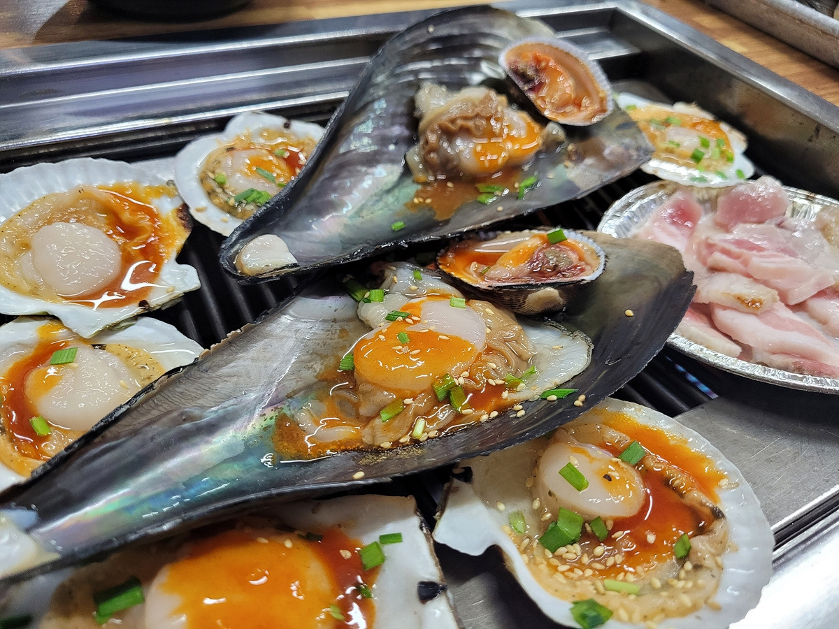 대천해수욕장 해변에는 조개구이집이 줄줄이 늘어서 있는데 그중에 괜찮은 곳을 지니님이 찾아내어 저녁을 배부르게 먹는다. 삼겹살, 그것도 냉동 삼겹살을 안 좋아하는 지니님이 그렇게 삼겹살을 잘 먹을 줄 몰랐다.