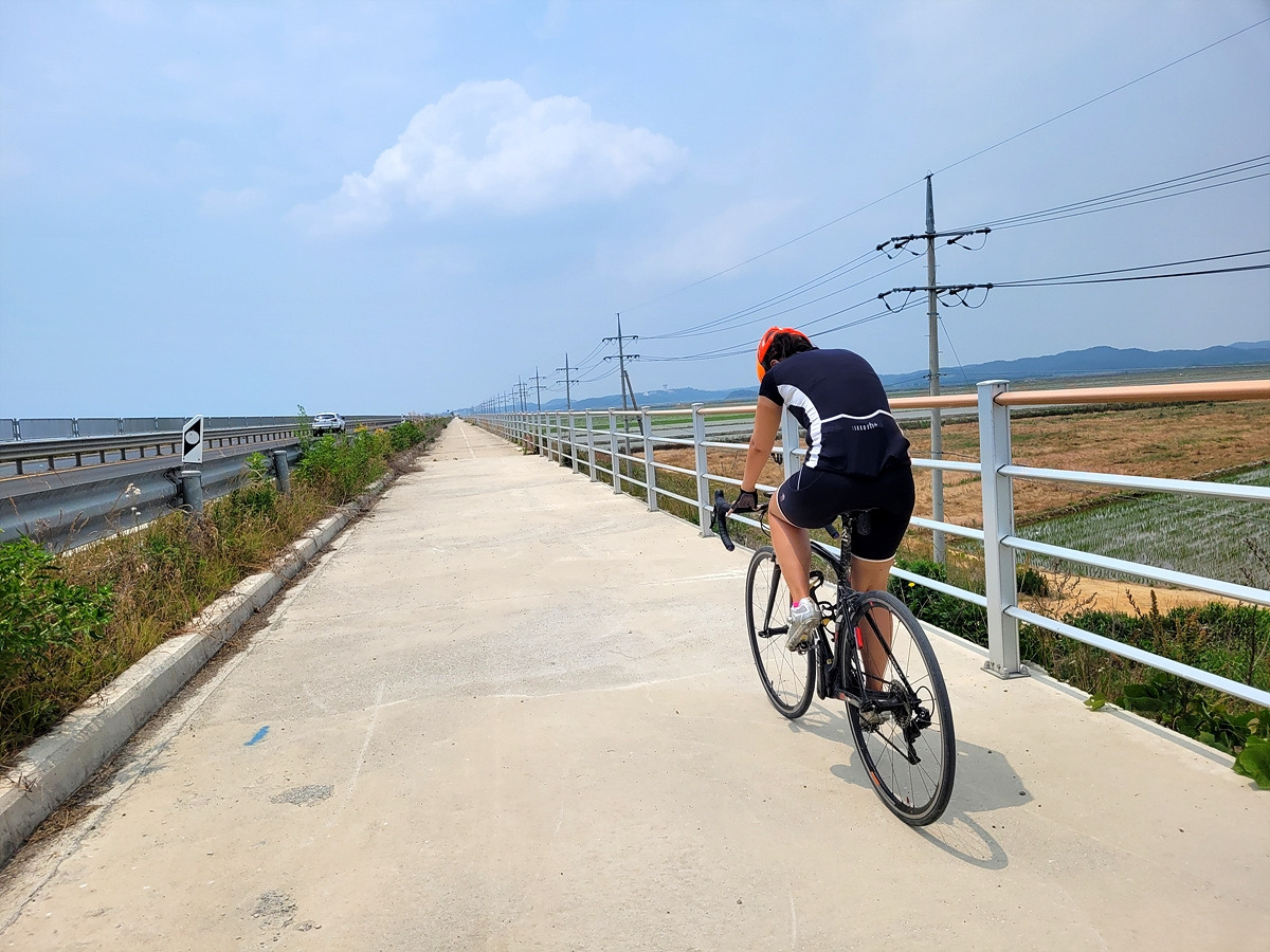 시화 방조제길도 그렇지만 직선으로 쭉 뻗은 방조제 자전거길은 바다가 잘 보이는 것도 아니고 풍경이 단조로워서 심심하다. 바다 쪽으로는 차들이 쌩쌩 달리는 삭막한 풍경이지만 오른쪽으로는 간척지의 넓은 평야가 펼쳐진다.