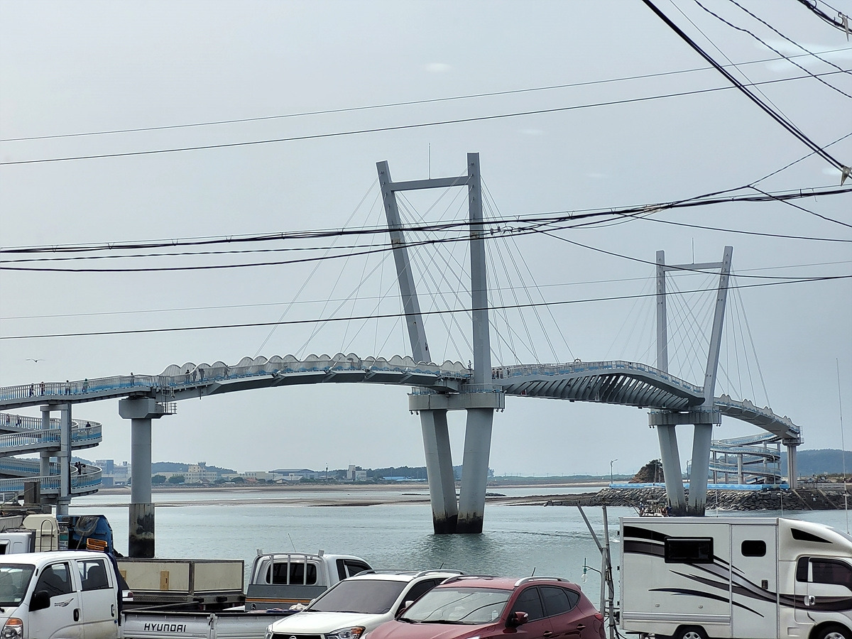 드르니항의 꽃게 다리가 보인다. 배들이 통행하는데 방해가 되지 않도록 높게 지은 인도교다.