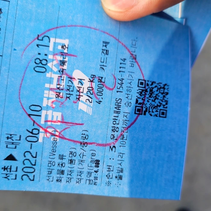 8시가 넘으니 여객터미널 대합실에 사람이 보인다. 뱃삯을 결제하고 표를 받아둔다. 배값은 1인당 7,200원에 자전거 비용 2,000원 별도다. 유류할증료가 있어 그때그때 조금씩 다른 듯하다.