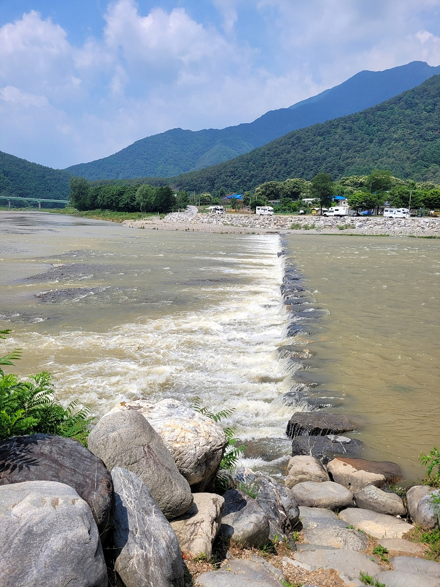 며칠 전에 온 비로 물이 많이 불어서 아우라지 징검다리는 물에 잠겨있다.