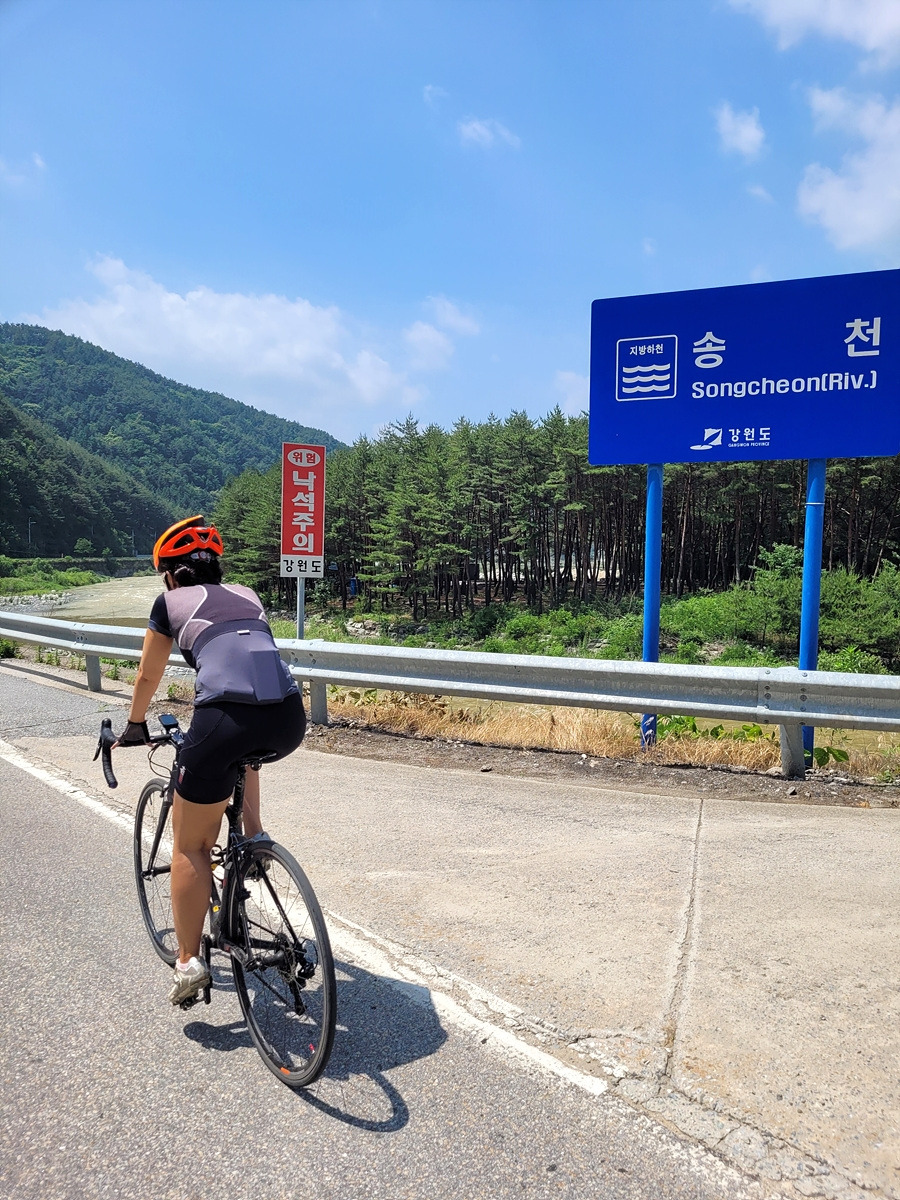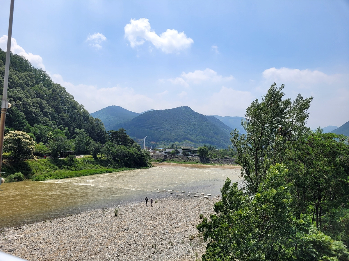 옆에 흐르던 계곡이 더 넓어지면 횡계에서 흘러내린 송천이다. 송천이라는 이름답게 강 옆으로 소나무들이 많다.