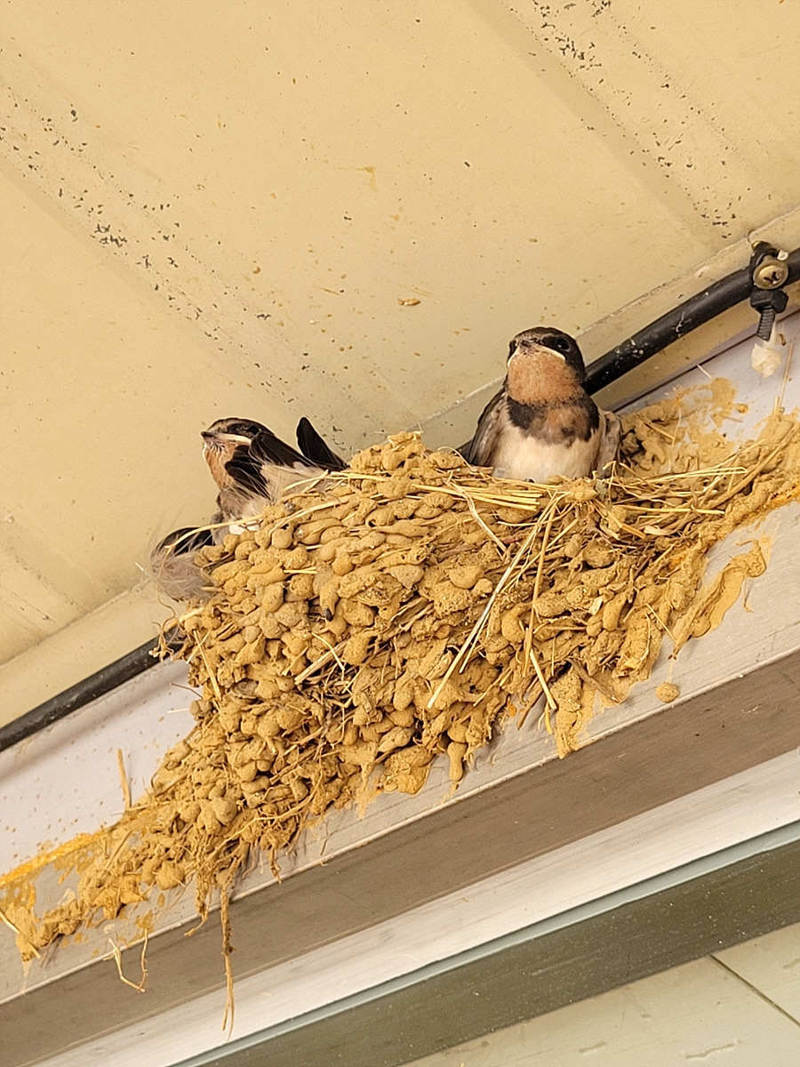 후식으로 편의점에서 음료수를 마시는데 처마 밑에 제비 새끼들이 보인다.