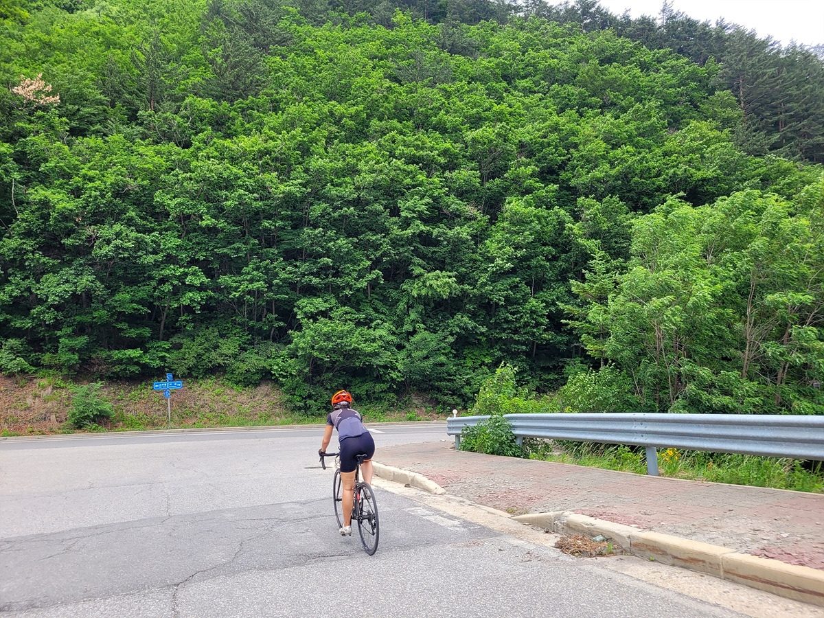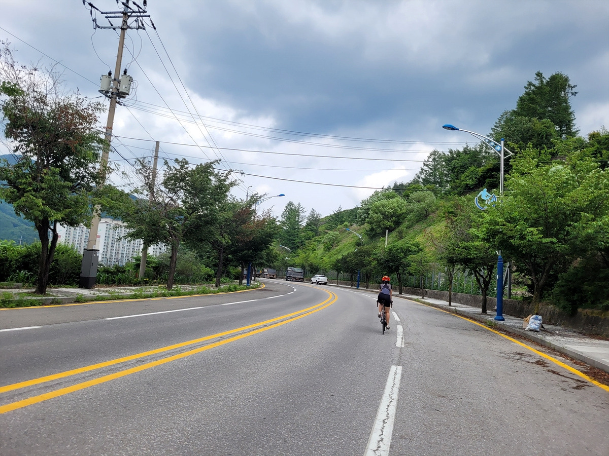 이대로 쭉 내려가면 열심히 준비하고 나왔는데 오르막길 한 번 올라간 것뿐이라 뭔가 아쉽다. 훈련이 되려면 오르막길을 두 번은 올라가야 한다. 오투리조트 클럽하우스 입구를 지나쳐서 조금 더 가면 오투리조트 콘도 들어가는 길이 있다. 이 길로 들어가면 오르막길은 한 번 더 올라갈 수 있다. 콘도 삼거리에서 콘도 방향으로 가면 오르막길을 좀 더 길게 할 수 있지만 경사가 좀 있어서 삼거리까지만 가도 은근히 힘드니 삼거리에서 스키장 쪽으로 빠진다.