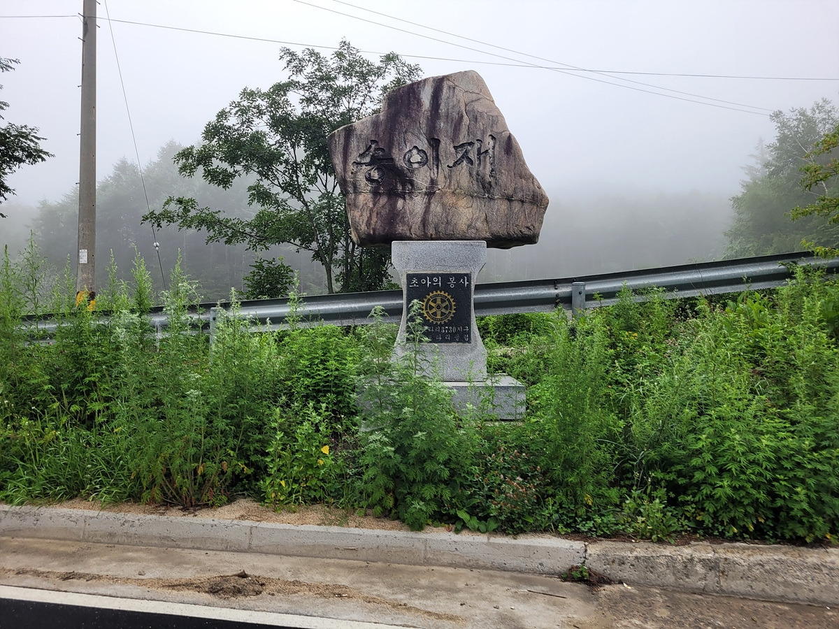 중앙분리대가 있고 은근히 차량 통행량도 많은 큰길이지만 송이재 정상 부근은 길이 넓으니 부담이 덜하다.