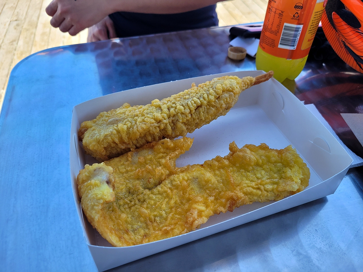 Hampden은 1번 국도가 지나는 작은 언덕 꼭대기에 마을 중심이 있다. 마침 문 연 식당이 있어 들어갔다. 현지 식당은 피시 앤 칩스나 햄버거가 주 메뉴다. 핫도그와 생선튀김을 주문해서 음료수와 함께 간단하게 점심을 때운다. 다음 날 배탈이 났는데 아무래도 좀 특이한 맛이 나던 이 핫도그가 원인인 듯하다.