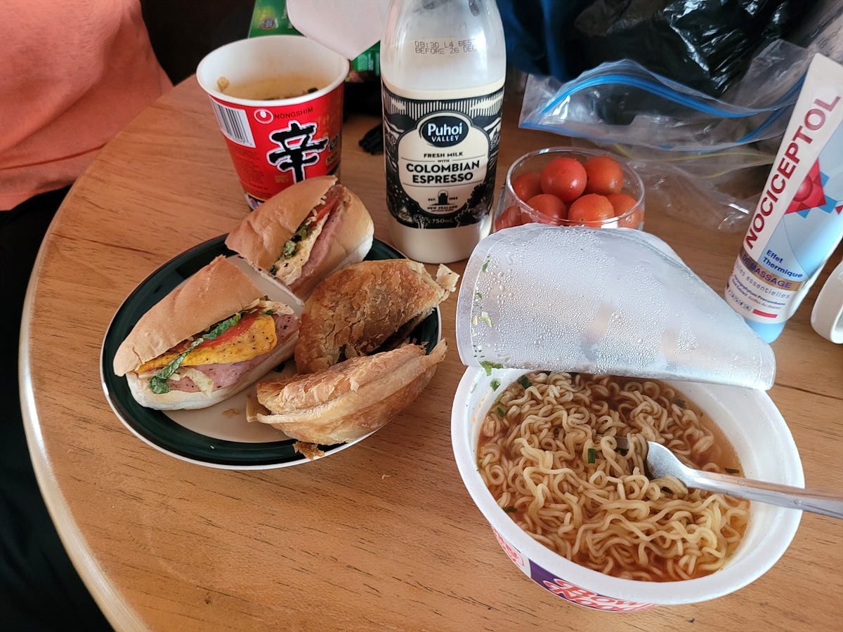 뉴질랜드의 여름은 아침 7시만 되어도 대낮같이 환하다. 어제저녁에 장 봐둔 식량으로 아침을 먹는다. 한국에서 파는 가격을 생각하면 컵라면이 결코 저렴한 게 아니지만 그래도 여기 음식들에 비하면 그나마 싼 편이다. 푸호이 밸리 커피우유는 크림이 들어가서 그런지 좀 느끼하고 달달한 맛인데 가격도 비싼 편이다. 그래도 내 입맛에는 잘 맞는다. 커피맛이 가장 인기라 커피맛만 재고가 없을 때가 많다고 한다.