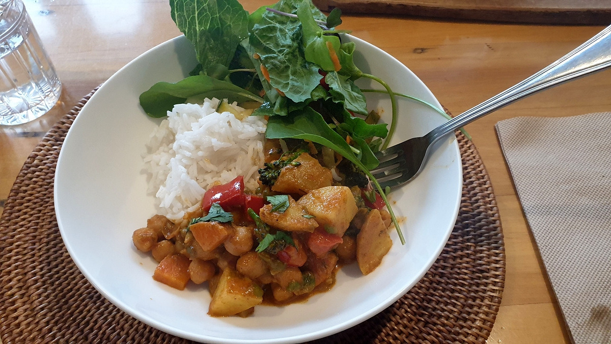 근처에 뭘 사 먹을 곳이 하나도 없는 대신 예약하고 추가 비용을 내면 저녁 식사를 할 수 있는 곳이다. 주인아주머니가 채식주의자인지 온통 풀들로 구성된 조촐한 식사다.