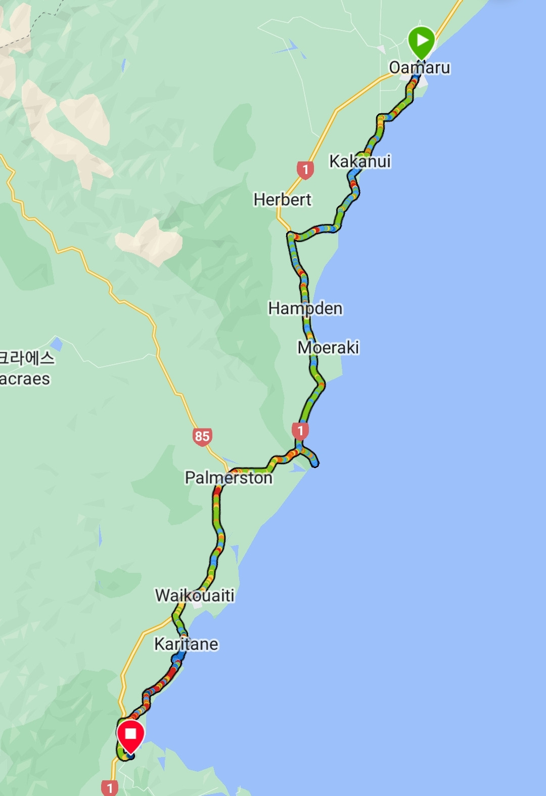오아마루에서 와이아나카루아(Waianakarua)까지는 1번 국도를 피해서 둘러갈 수 있다. 카운트다운 마켓 앞에서 1번 국도를 벗어나서 오아마루 중심가의 성당 쪽부터 언덕을 하나 넘어가면 해변을 따라 달리는 길이 있다.