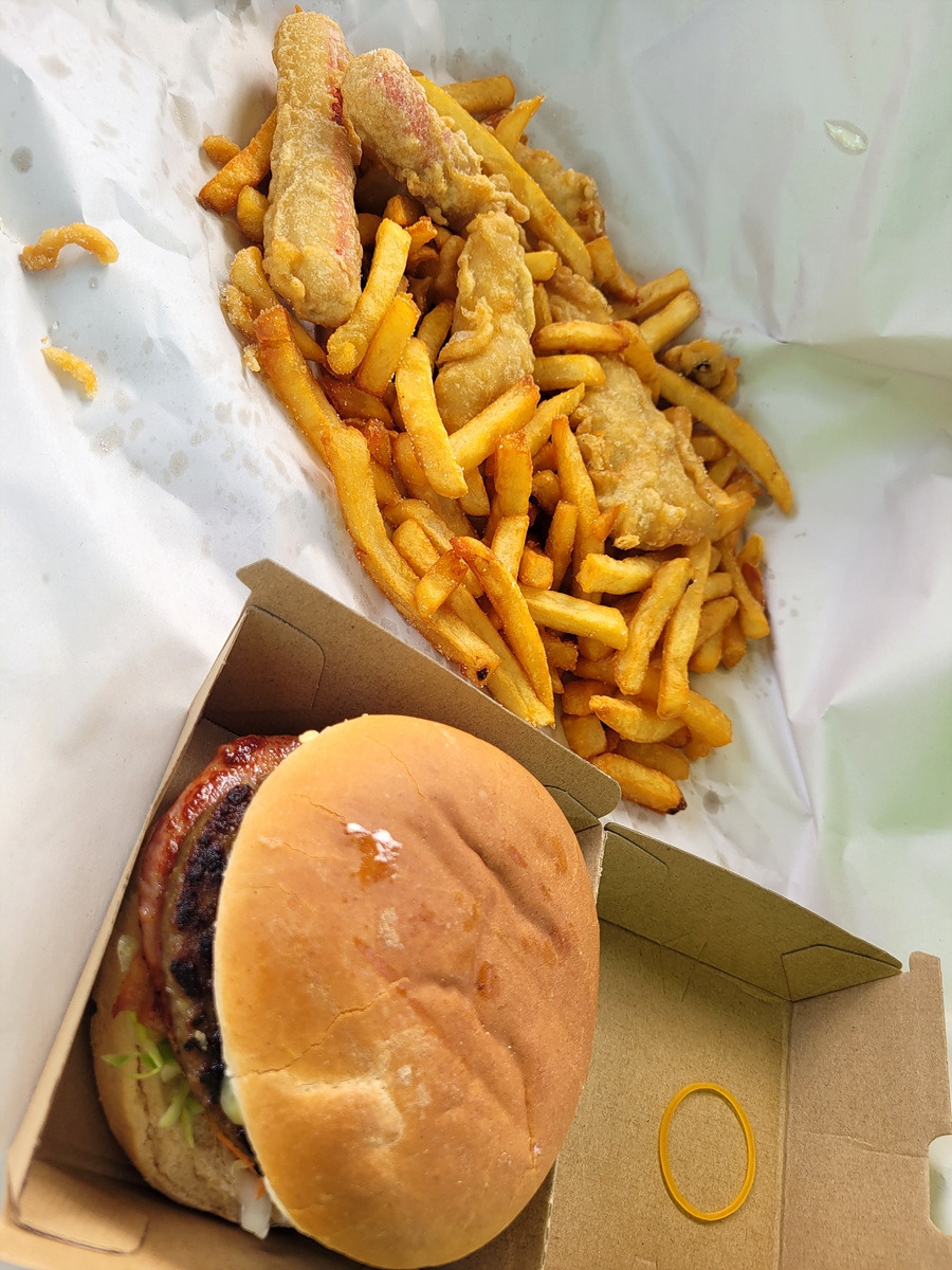 마을에 작은 테이크 아웃 식당이 있어서 들어갔다가 햄버거와 피시앤 칩스를 주문했다. 가게에서 먹을 수 있는지 물어보니 바로 건너편의 공원에서 먹으라고 한다. 작은 정자 같은 곳에 앉아서 받은 상자를 열어보니 피시앤 칩스가 한가득이다.