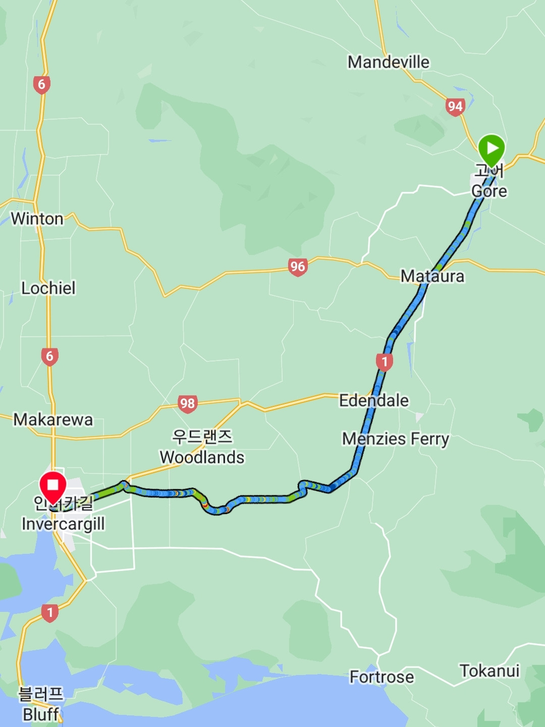 이동 경로 및 이동 거리: 고어(Gore) - 인버카길(Invercargill) 72 km