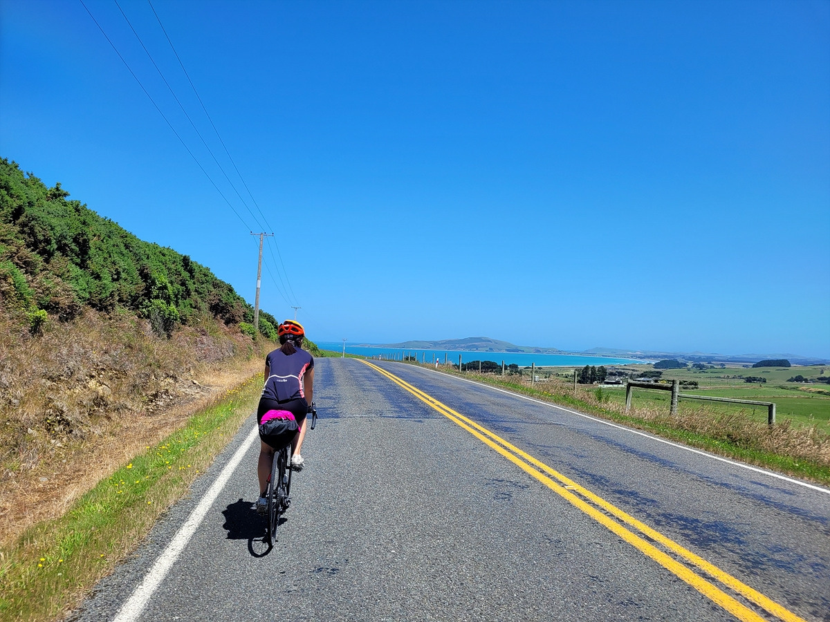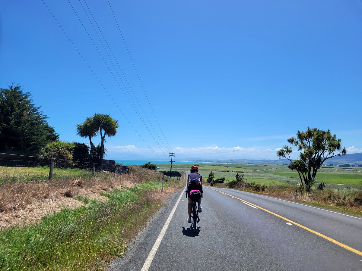 이제 리버턴/아파리마를 벗어나면 다시 초지가 펼쳐진다. 저 앞에 바다도 보인다. 뉴질랜드 남섬 코스는 의외로 바다를 볼 일이 많지 않기에 푸른 바다가 보이면 기대가 된다.