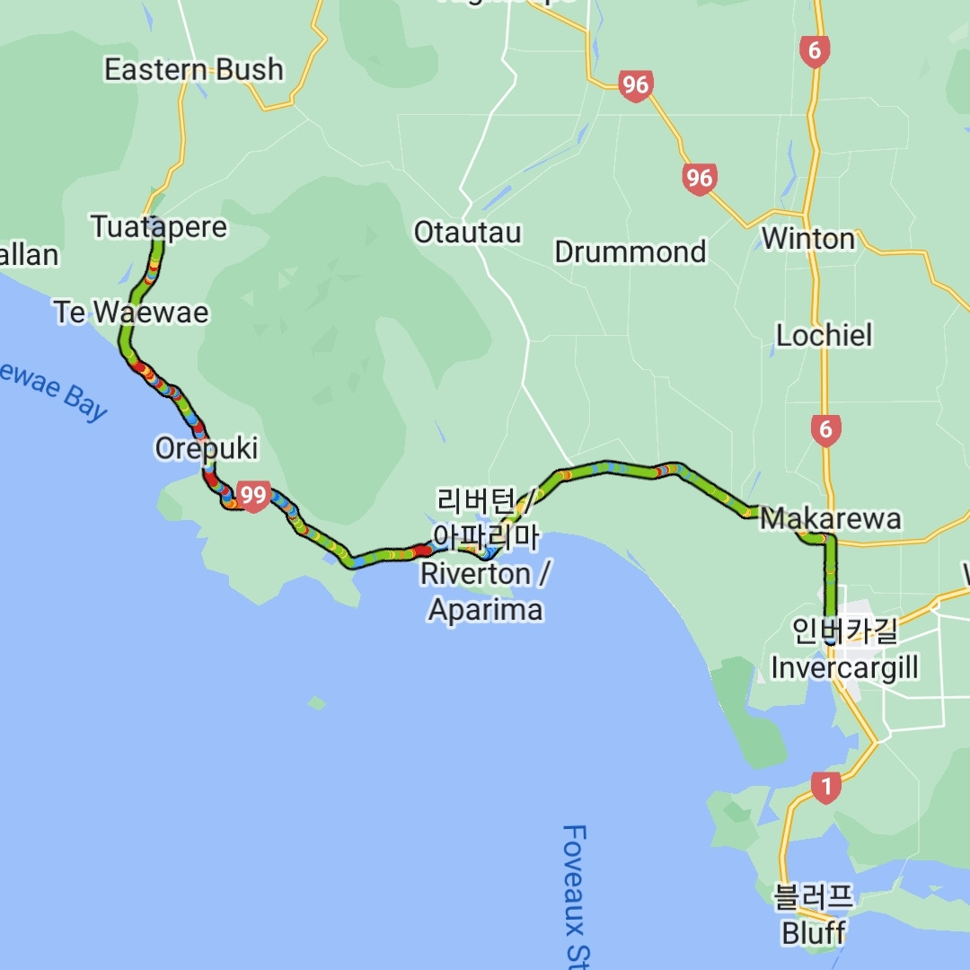역시나... 바다에 그리 바짝 붙어서 달리진 못한다. 한참을 달리다가 오레푸키(Orepuki)라는 마을에 들어가서 잠시 화장실도 들르면서 쉬어간다. 여기도 마을 입구에 문 연 카페가 하나 있는데... 사람도 많아 보이는 데다가 이미 점심을 애매하게 먹어버려서 들르진 않는다.