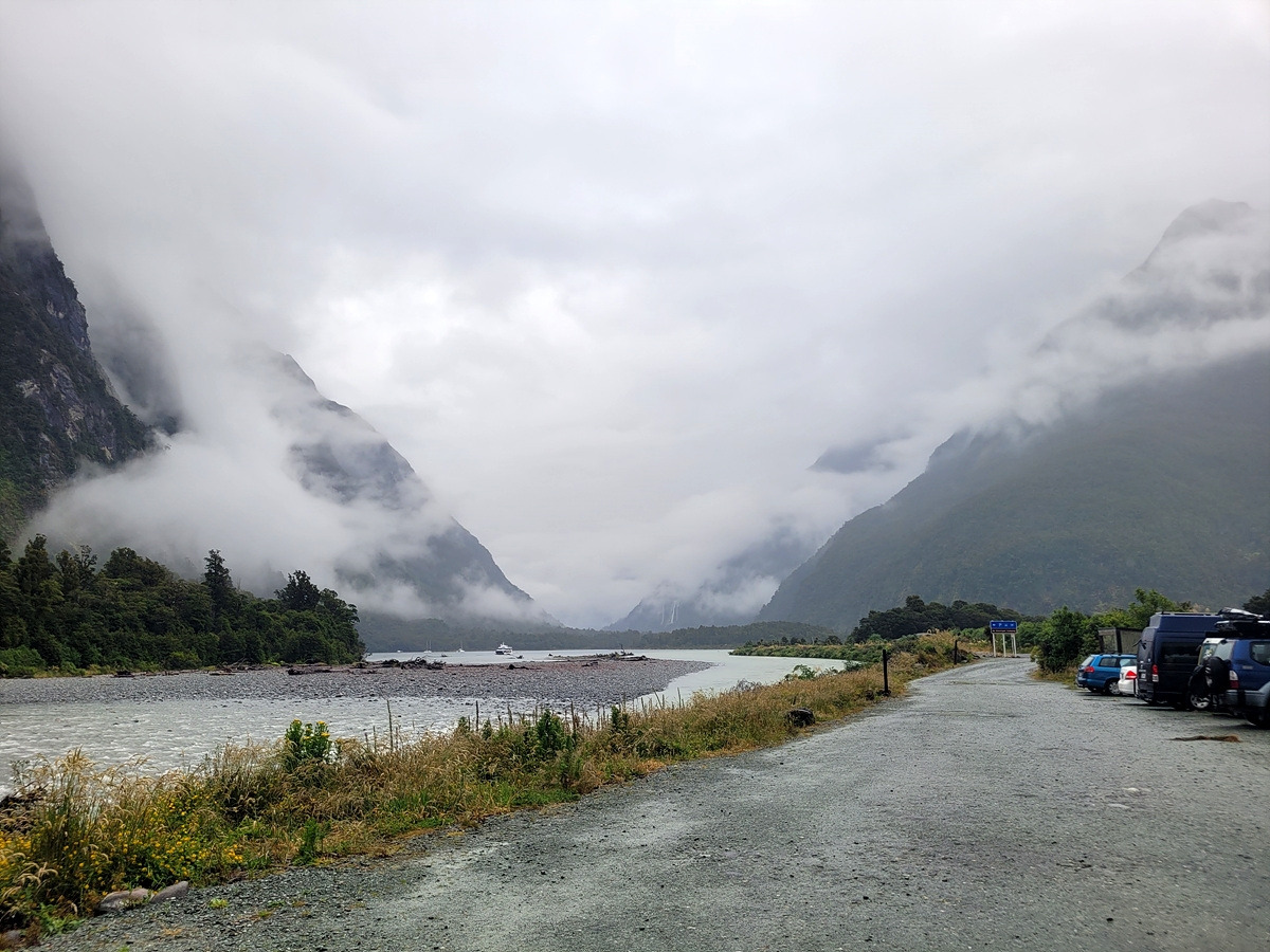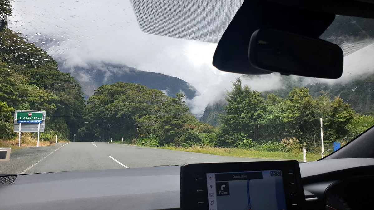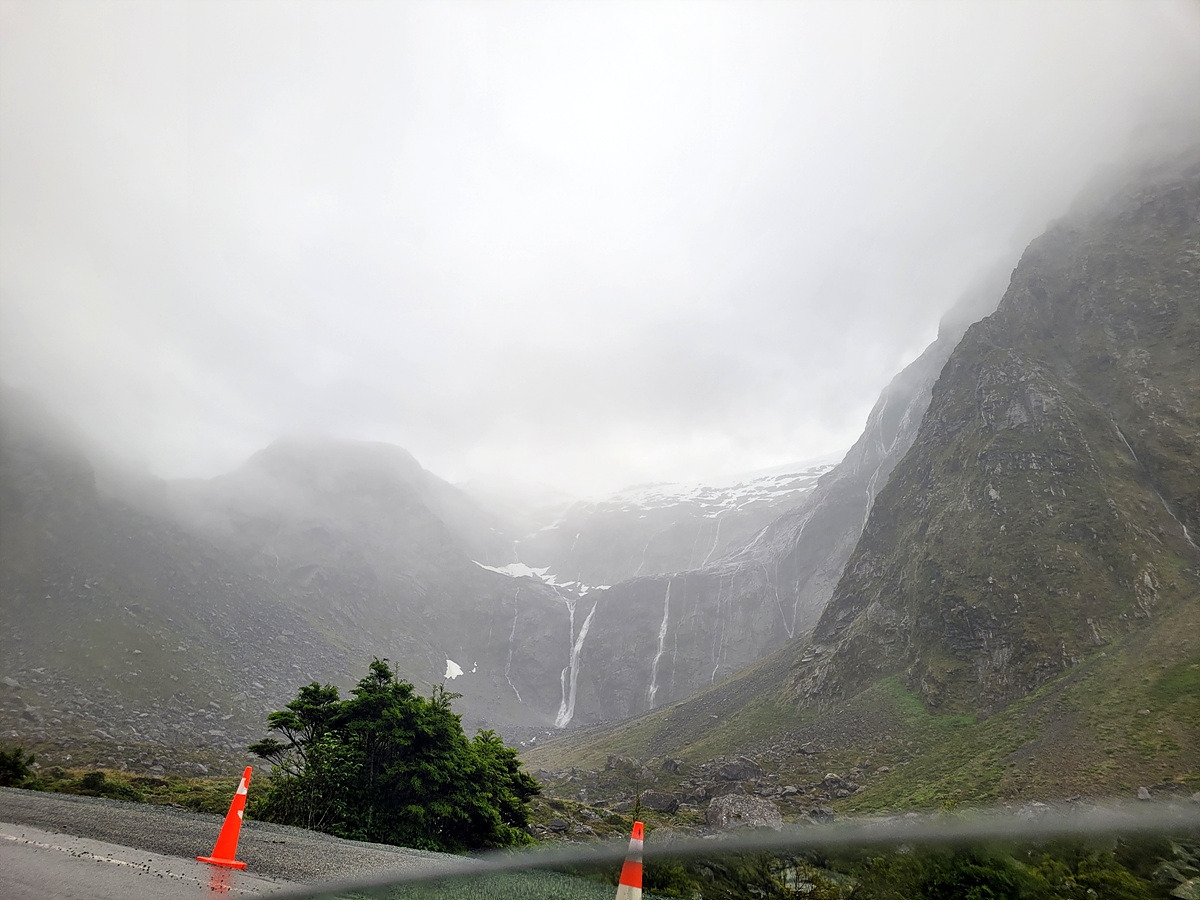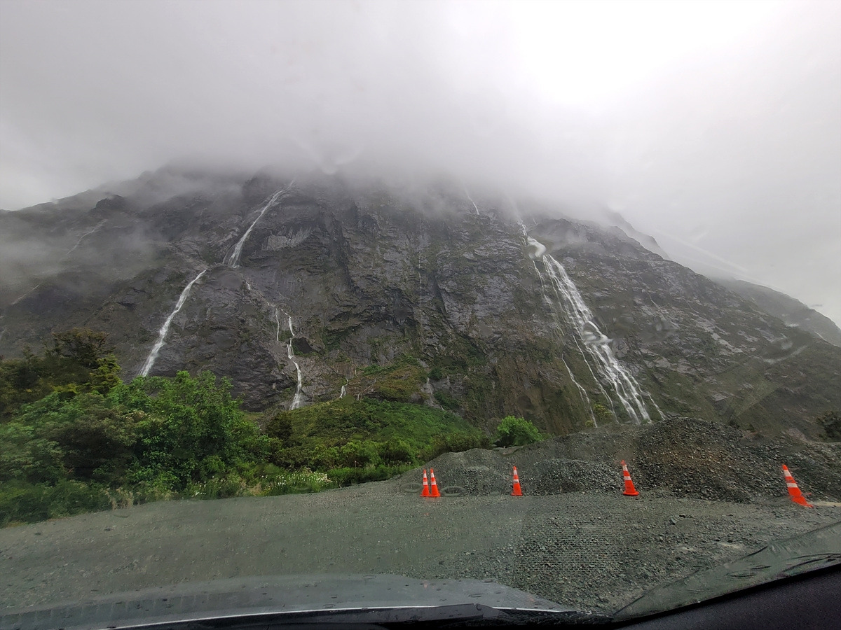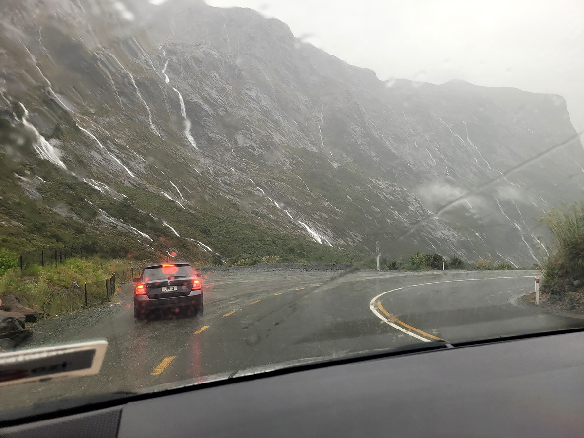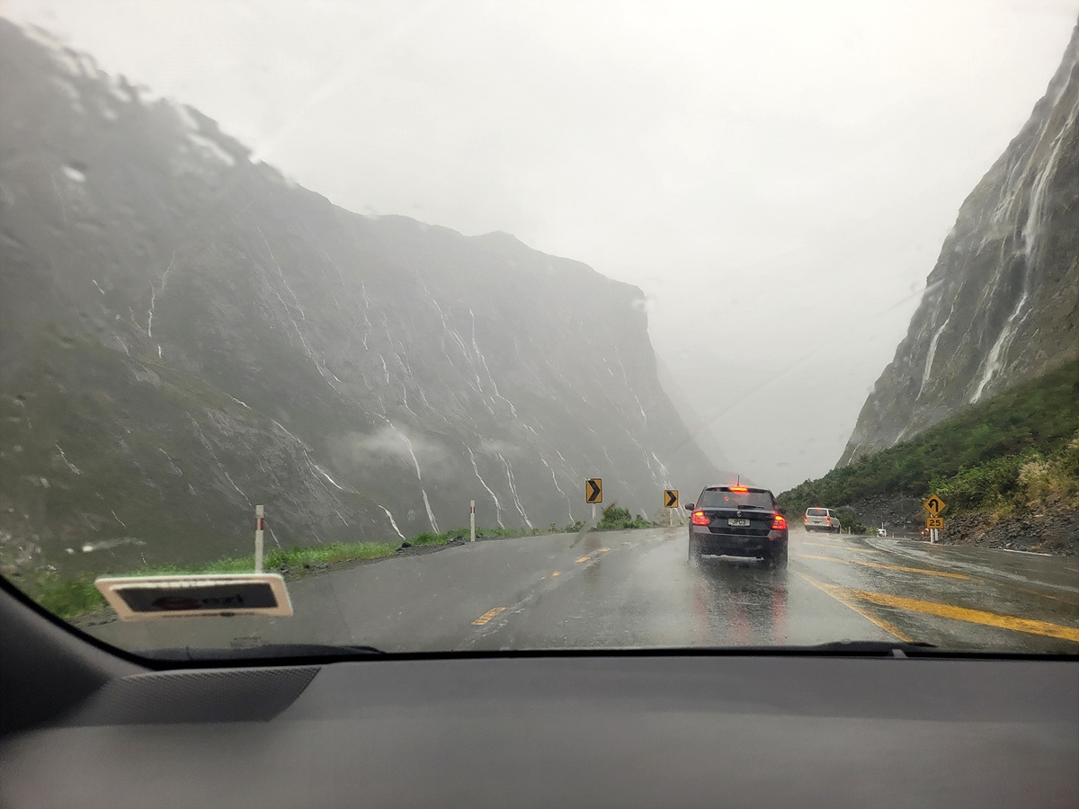 여러 번 말하지만 여행은 날씨가 중요한데 밀포드 사운드는 비가 자주 오는 곳이다. 날씨가 좋을 것을 기대하진 않았지만 비가 오는 그 자체 만으로 장관을 만들어낸다. 아직 밀포드 사운드 근처에도 못 갔는데 이런 경치라니...