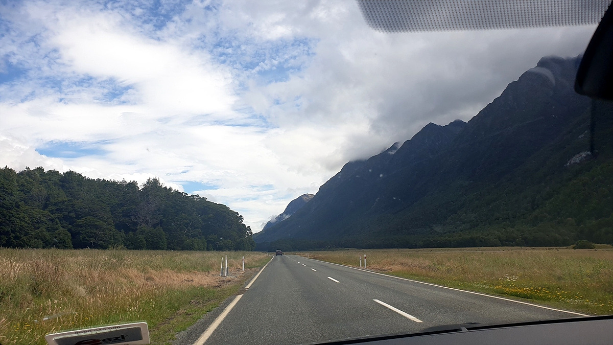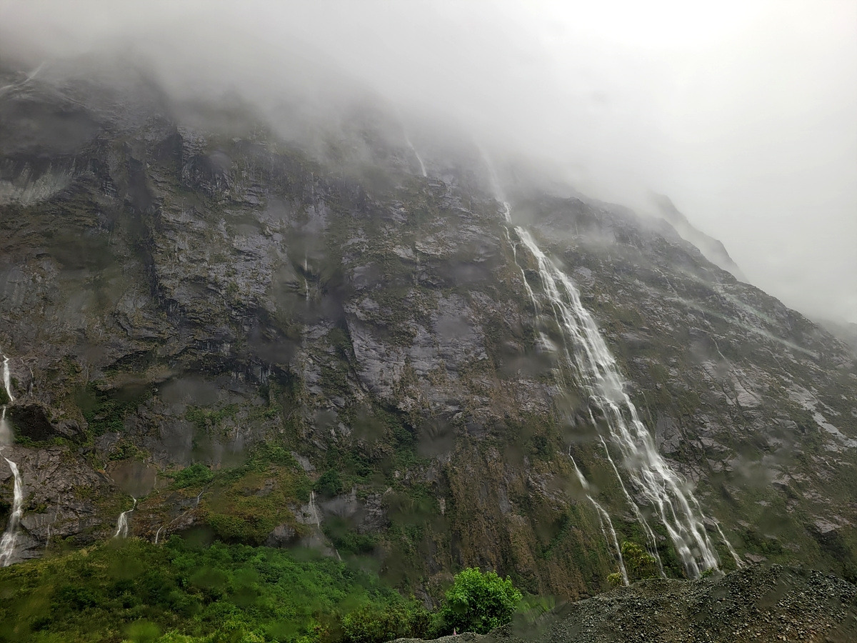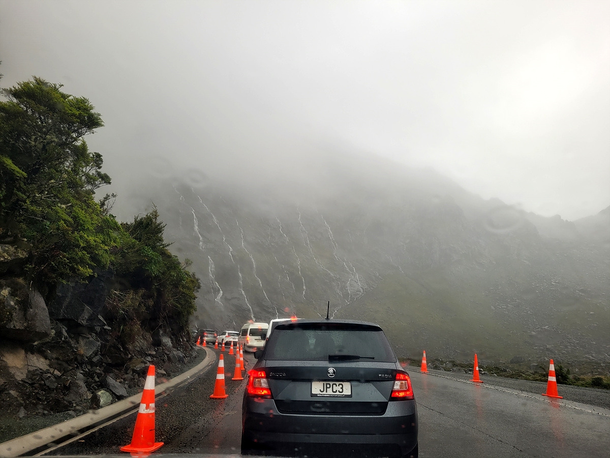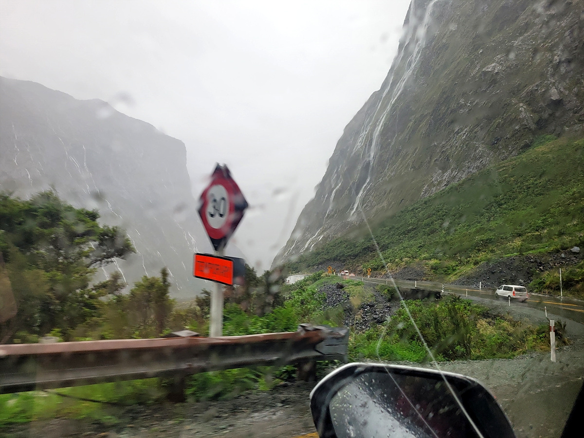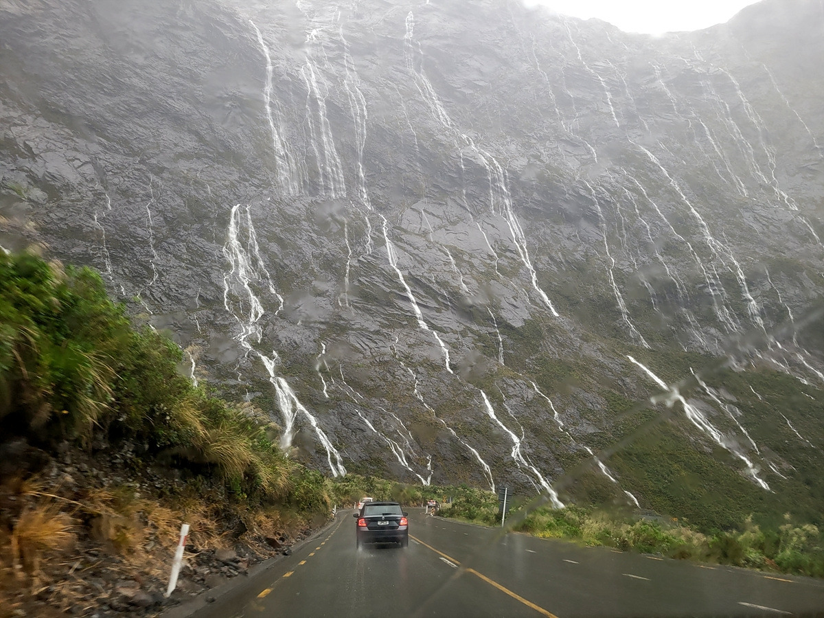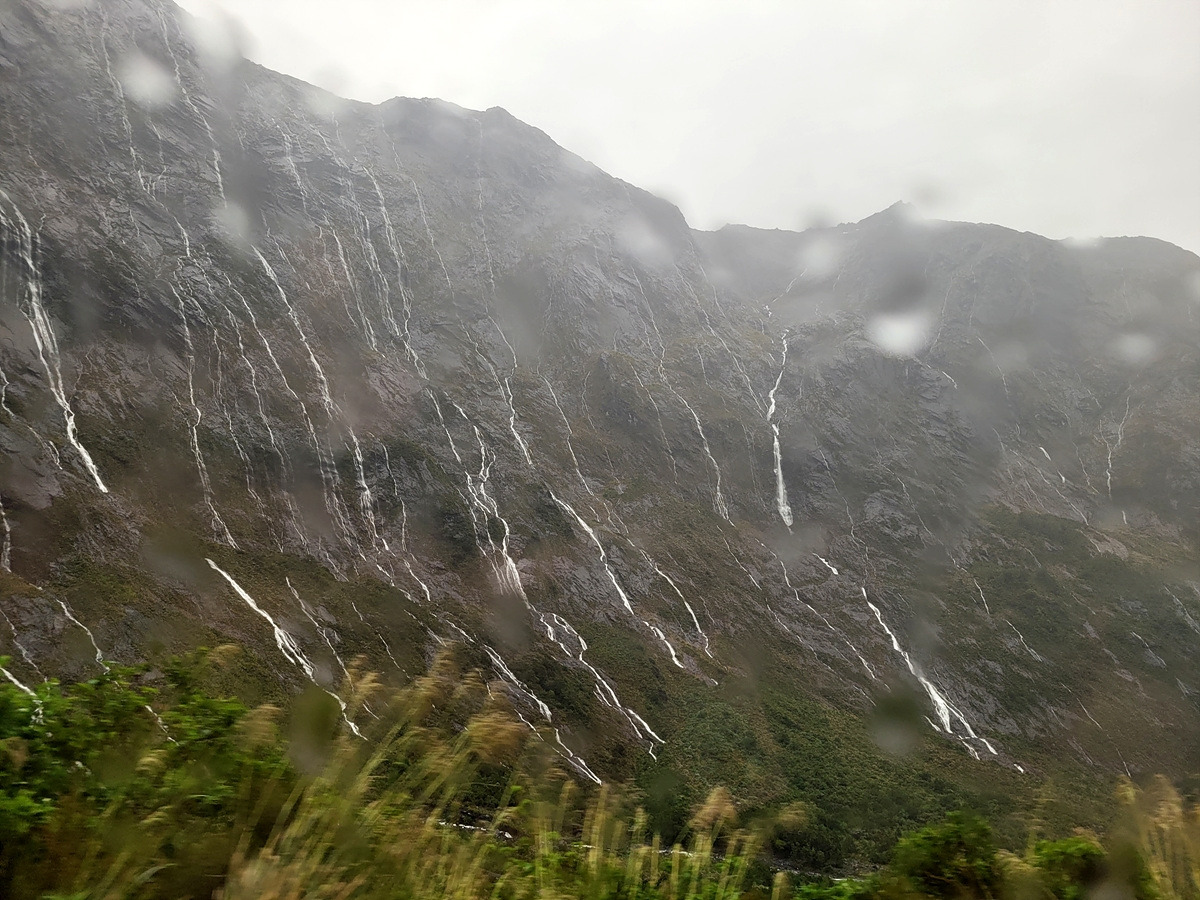 여러 번 말하지만 여행은 날씨가 중요한데 밀포드 사운드는 비가 자주 오는 곳이다. 날씨가 좋을 것을 기대하진 않았지만 비가 오는 그 자체 만으로 장관을 만들어낸다. 아직 밀포드 사운드 근처에도 못 갔는데 이런 경치라니...