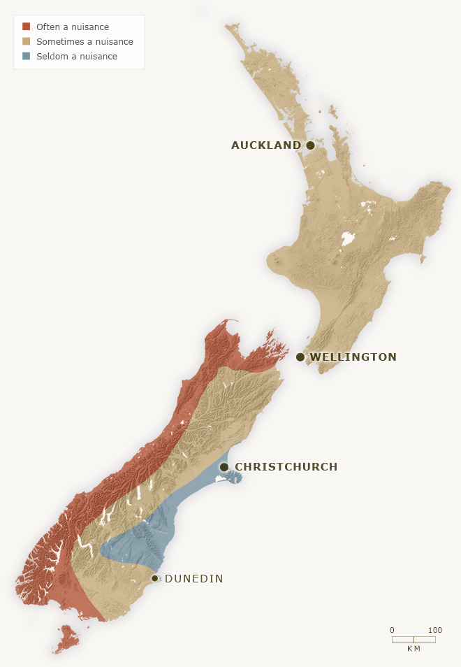 드디어, 지옥 같은 뉴질랜드의 악몽인 샌드플라이들에게 물어뜯겼다. 샌드플라이는 블랙플라이라고도 하는데 뉴질랜드 남섬의 서쪽 해안가에 많이 산다. 생긴 것은 초파리와 비슷하지만 사람의 피부를 뚫고 피를 빨아먹는 곤충으로 일단 물리면 아픈데 물리고 나면 2주 정도는 미친 듯이 가렵다. 이렇게 우리나라에 살지 않는 해충들은 우리나라에서 가져간 벌레 기피제들이 듣지 않으니 샌드플라이가 많은 지역에 갈 때는 그 지역의 샌드플라이 기피제를 약국에서 구입해서 사용하는 것을 권한다. 아니면 정말 지옥에 온 것 같은 경험을 할 것이다. 물렸을 때는 항히스타민 연고를 바르면 그나마 조금 빨리 낫는데 이 역시 그 지역 약국에서 구할 수 있다.