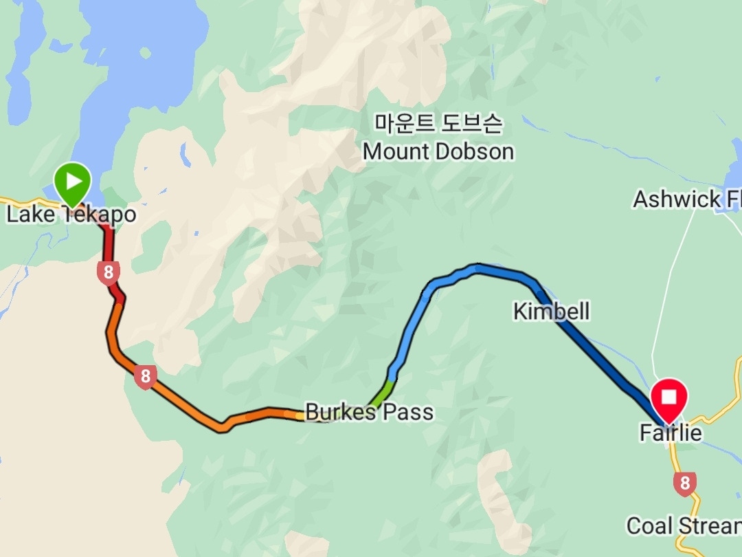 주행 경로 및 거리 : 테카포 호수 (Lake tekapo) - 페어리 (Fairlie) 43 km