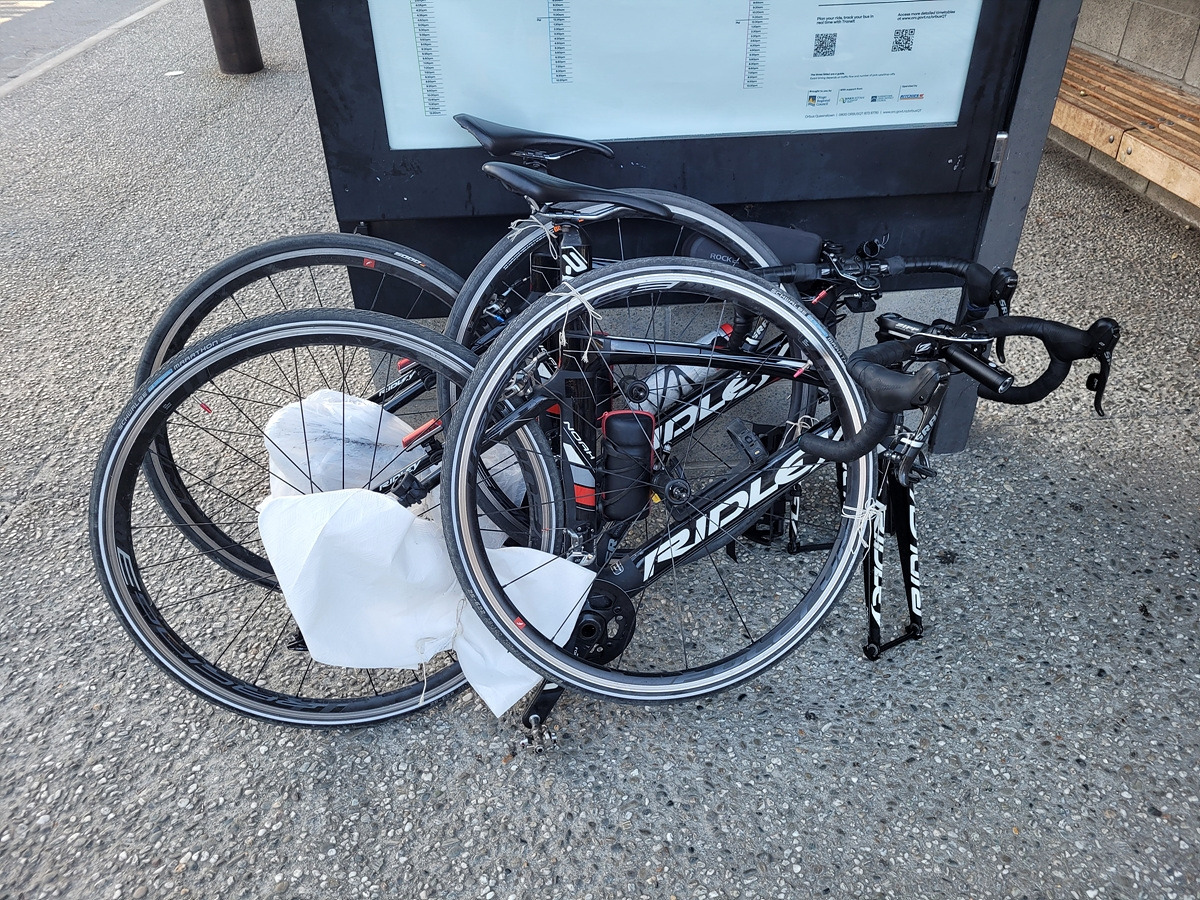 인터버스에서 자전거에 앞바퀴를 빼서 프레임에 묶으라고 했다. 그래야 자전거의 부피가 줄어든다. 묶을만한 끈이 없길래 마트에서 요리할 때 고기에 묶는 끈을 사다가 사용했다. 포크가 망가질까봐 포크 지지대도 설치했다. 체인은 기름으로 더럽기 때문에 다른 짐과 닿으면 다른 짐이 엉망이 될 수 있으니 커버도 씌워줬다. 이정도면 승차거부 당하진 않겠지...