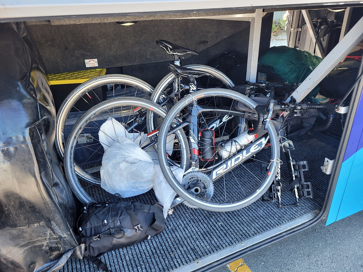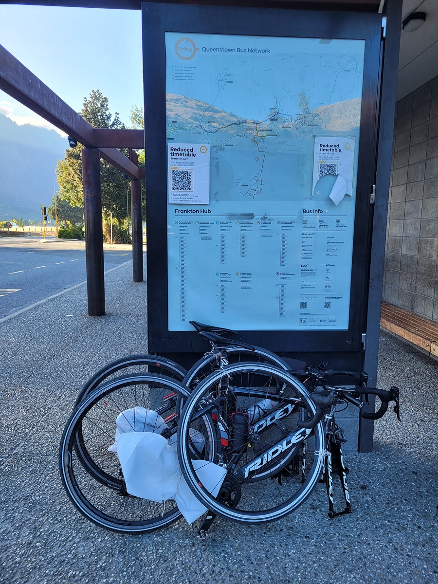 여기는 뉴질랜드 관광의 중심지인 퀸즈타운이다. 여기 퀸즈타운과 남쪽의 인버카길에는 크라이스트처치로 가는 시외버스인 인터버스가 있다. 인터버스 웹사이트에서 미리 예약하고 자전거도 가지고 탄다고 요청해두었다. 자전거는 앞바퀴를 떼어서 프레임에 묶어서 공간을 최소화시키고 체인에 커버를 씌워서 오염을 피할 수 있어야 태워줄 수 있으며 기사님에게 자전거 운송 내용을 전달하지만 당일 상황에 의해 실어줄 수 없을 수도 있다는 답변을 받았다.