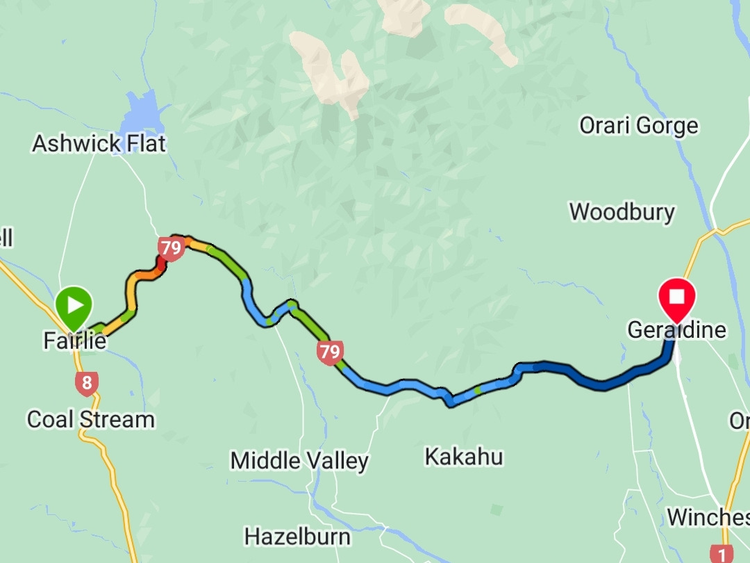 주행 경로 및 거리 : 페어리 (Fairlie) - 제랄딘 (Geraldine) 47 km