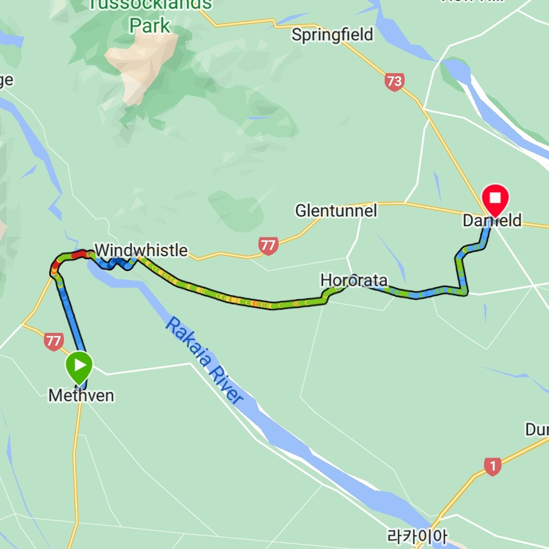길 끝에서 다시 77번 도로와 만나게 된다. 여기서 우회전하면 라카이아 고지 (Rakaia Gorge)로 가게 된다.