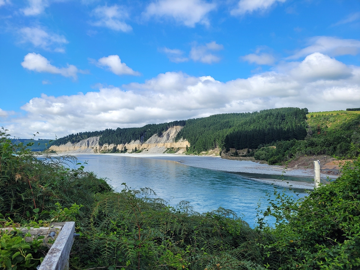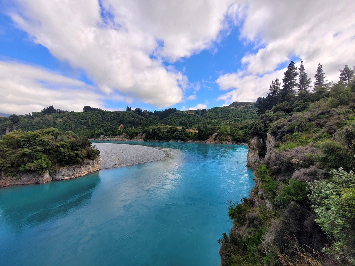 스키를 타러 가는 것이라면 마을을 벗어나서 만나는 갈림길에서 77번 도로를 따라 좌회전해야 하는데 우리는 라카이아 강을 건너가야 하니 작은 길을 그대로 따라서 직진하면 된다. 이제는 익숙한 뉴질랜드 내륙의 초지가 쭉 펼쳐진다.