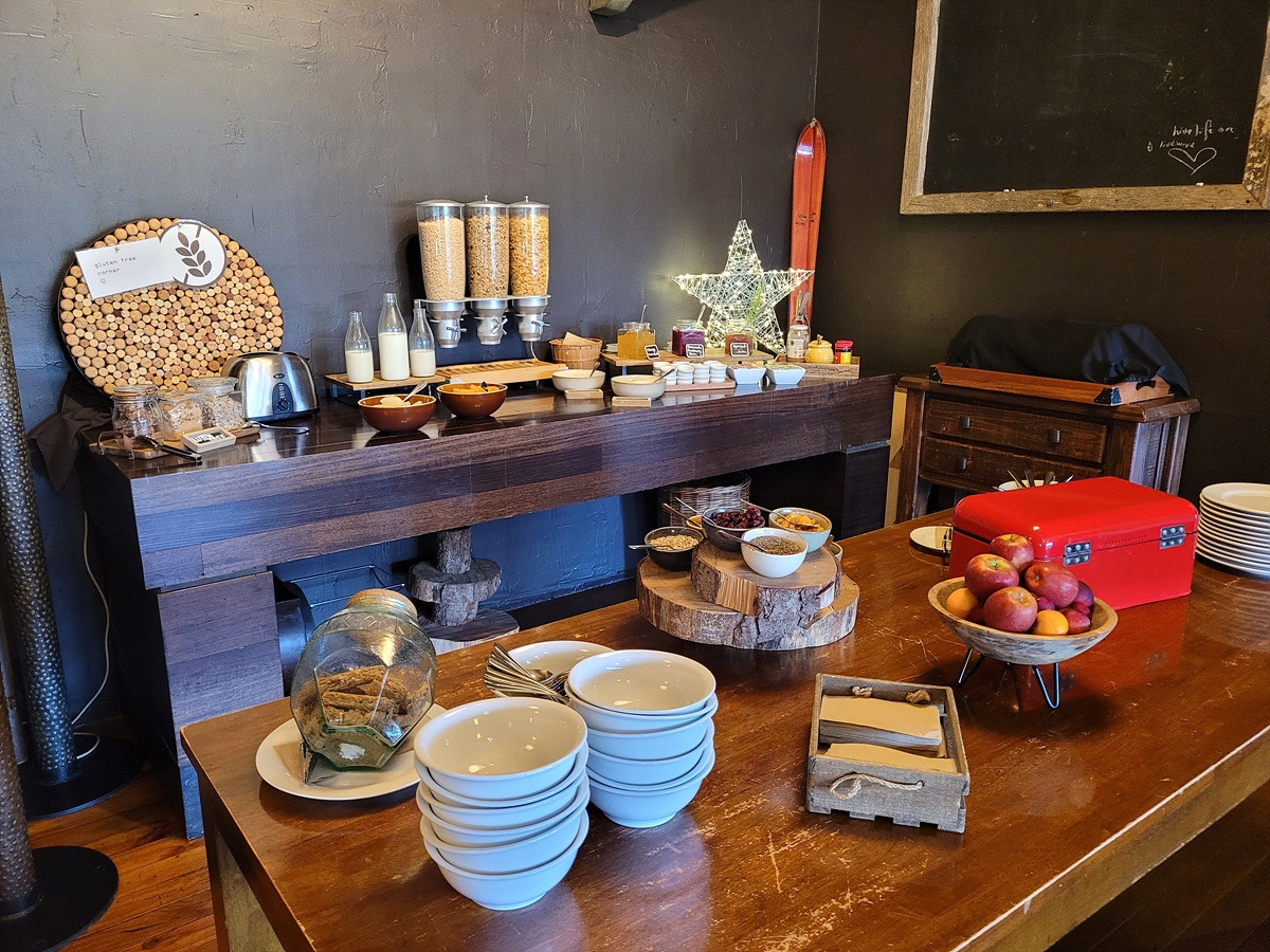 창 밖으로 평야가 쭉 펼쳐지다가 그 끝에 거대한 산이 보이는 테이블에 앉아서 조식을 먹는다.