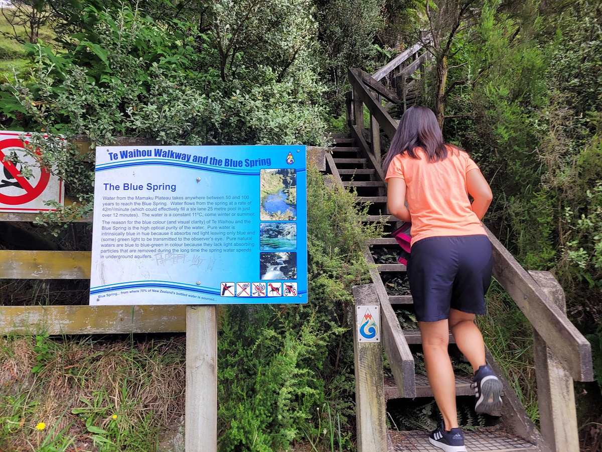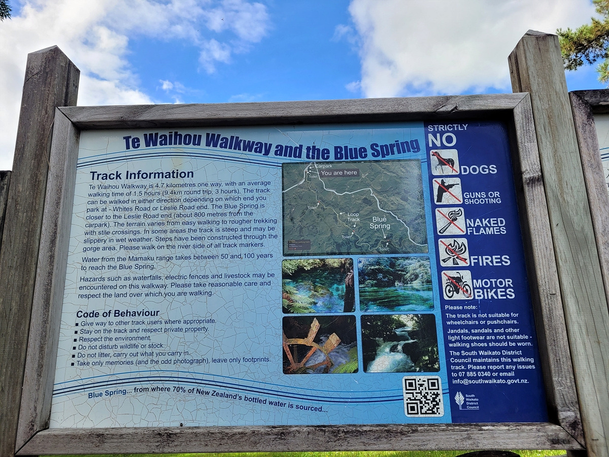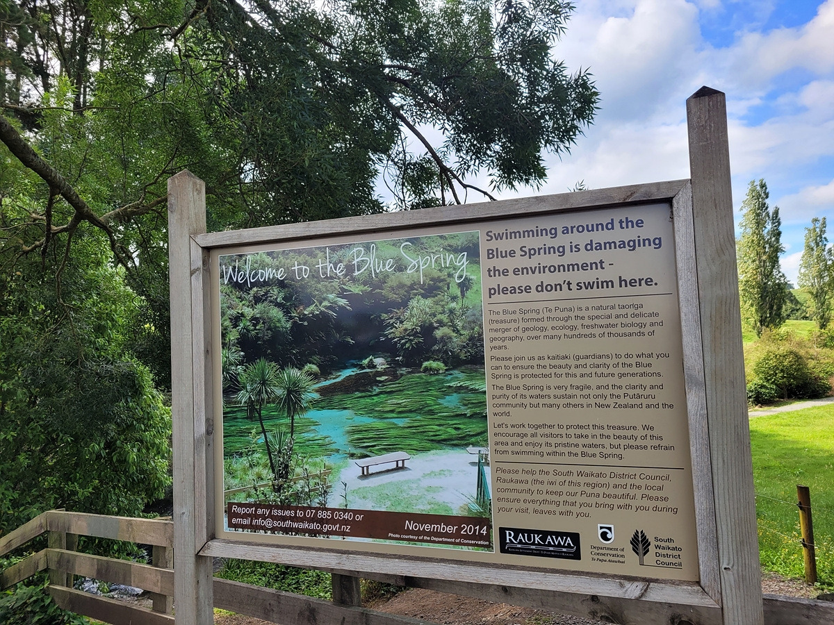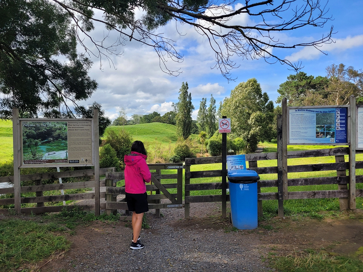 블루 스프링은 테 와이호우(Te Waihou) 산책로를 따라가면 만날 수 있다. 입구에 관련 정보가 안내되어 있다. 목장 구역을 통과해야 하기 때문에 동물이 탈출하지 않도록 문이 있다.