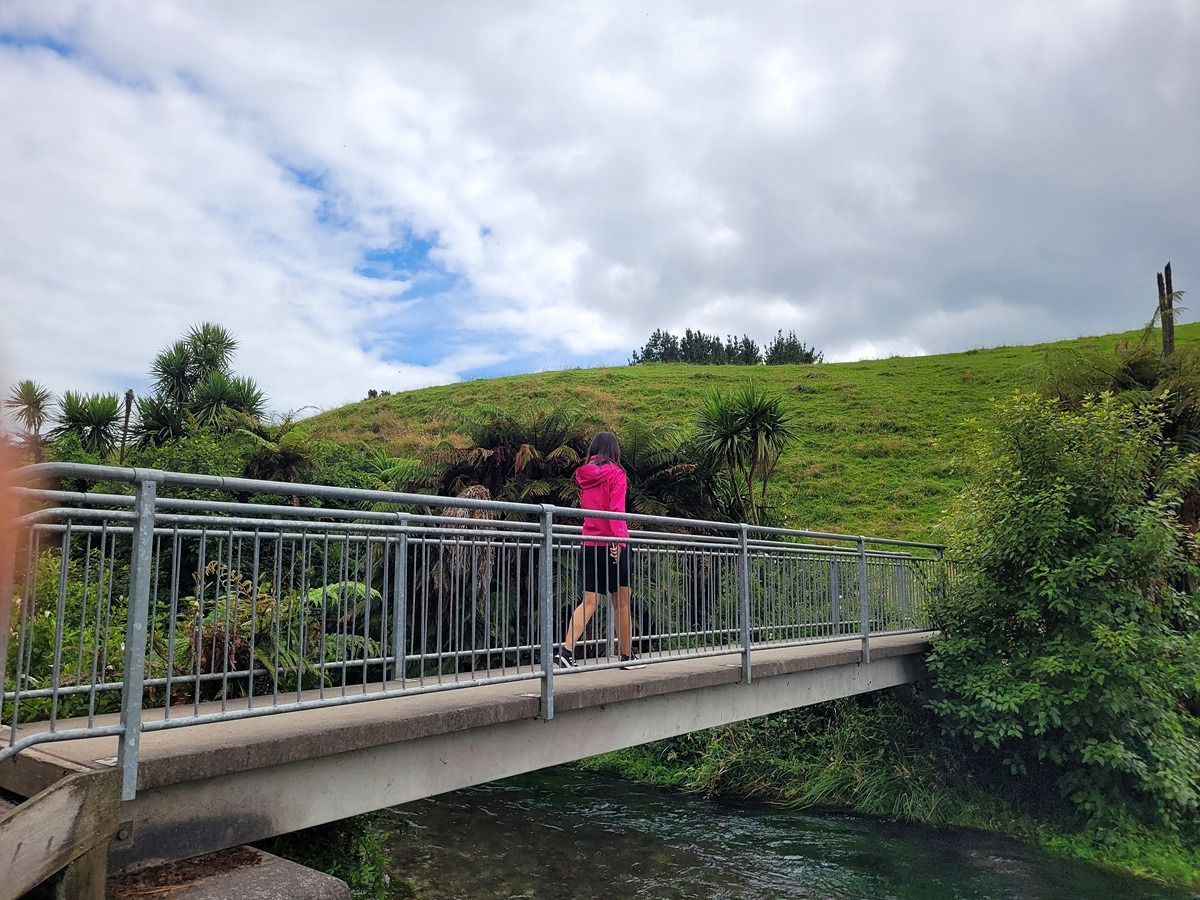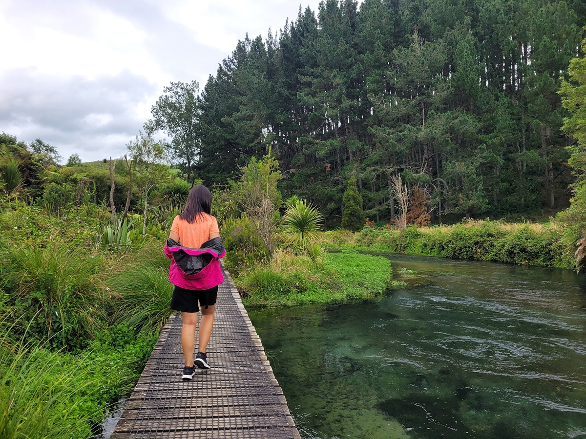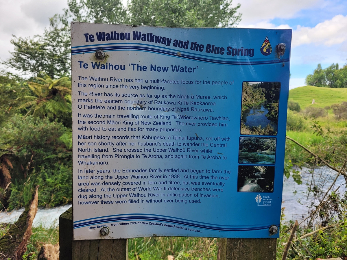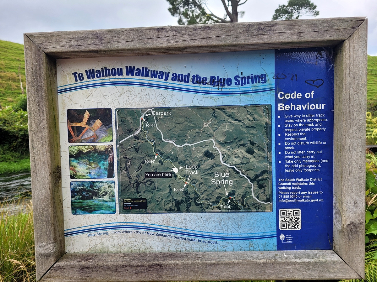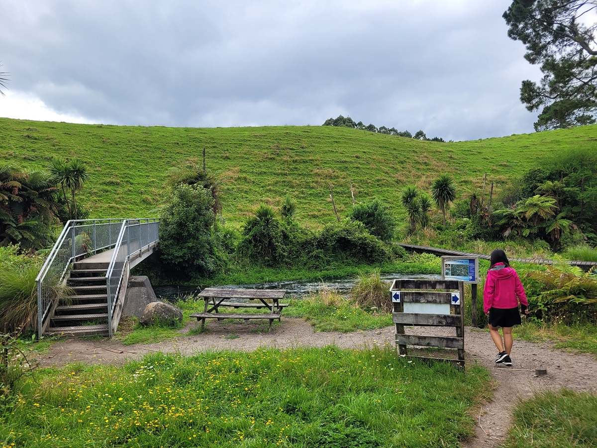 블루 스프링은 테 와이호우(Te Waihou) 산책로를 따라가면 만날 수 있다. 입구에 관련 정보가 안내되어 있다. 목장 구역을 통과해야 하기 때문에 동물이 탈출하지 않도록 문이 있다.