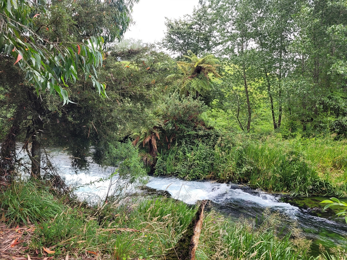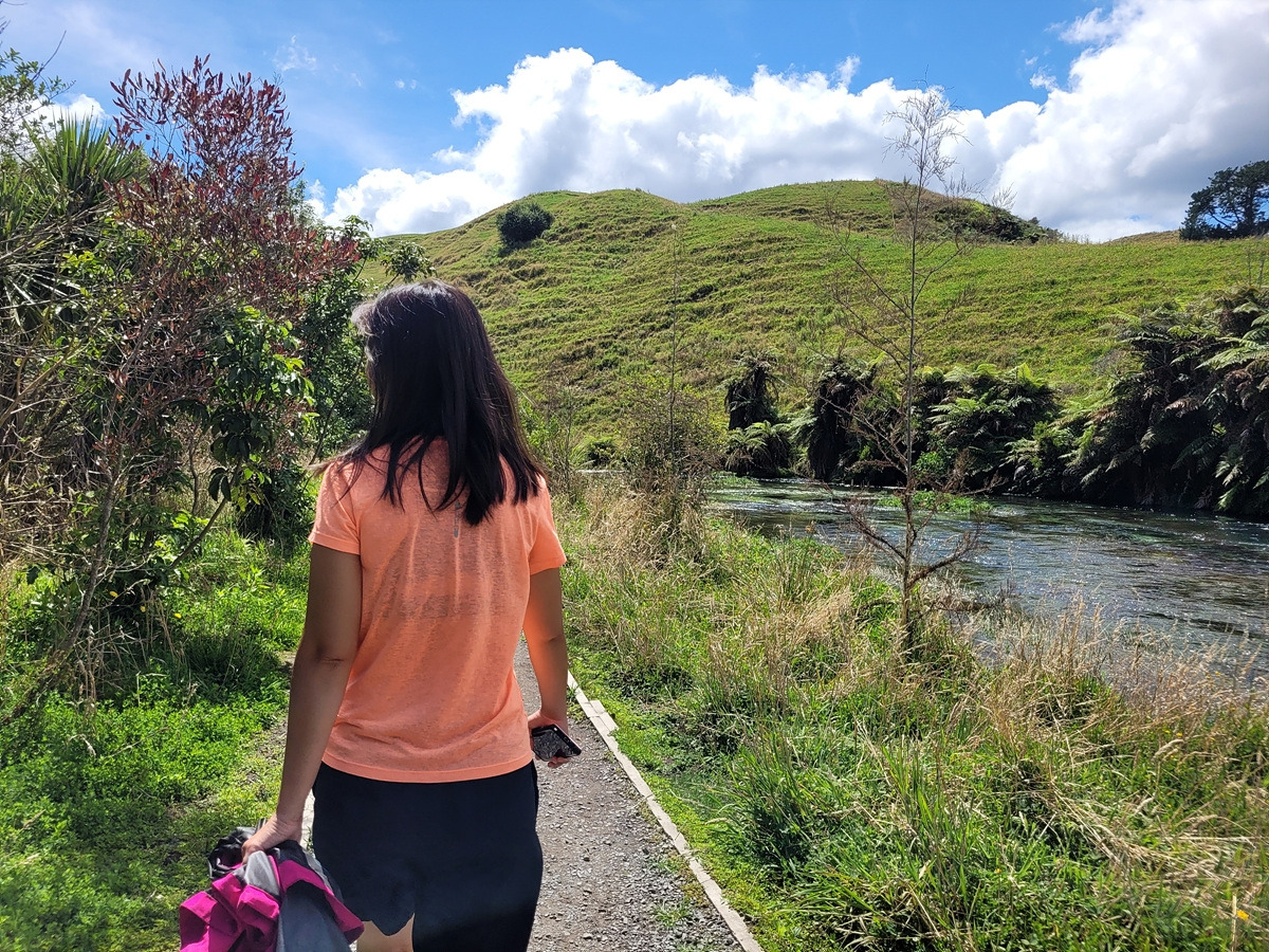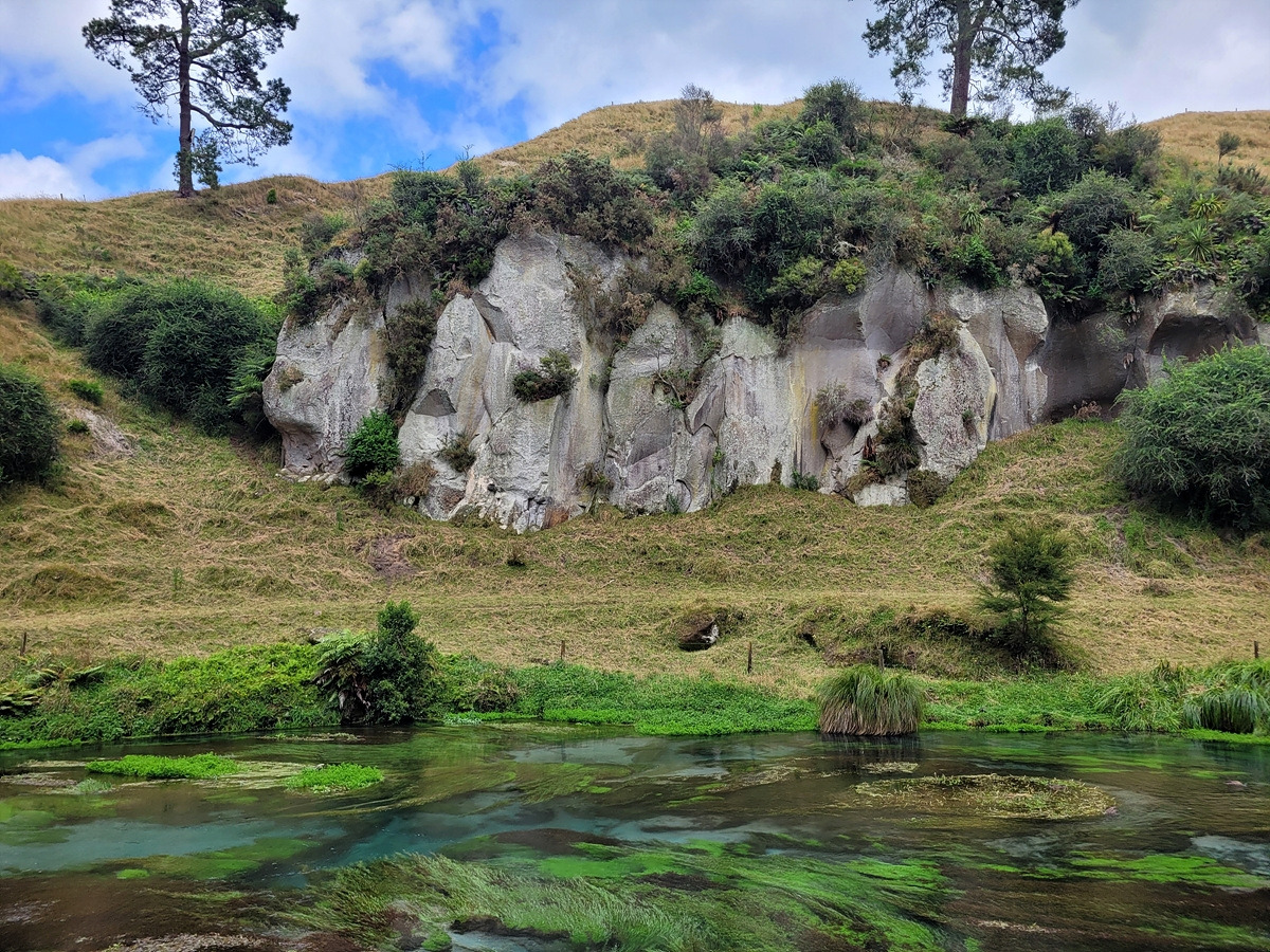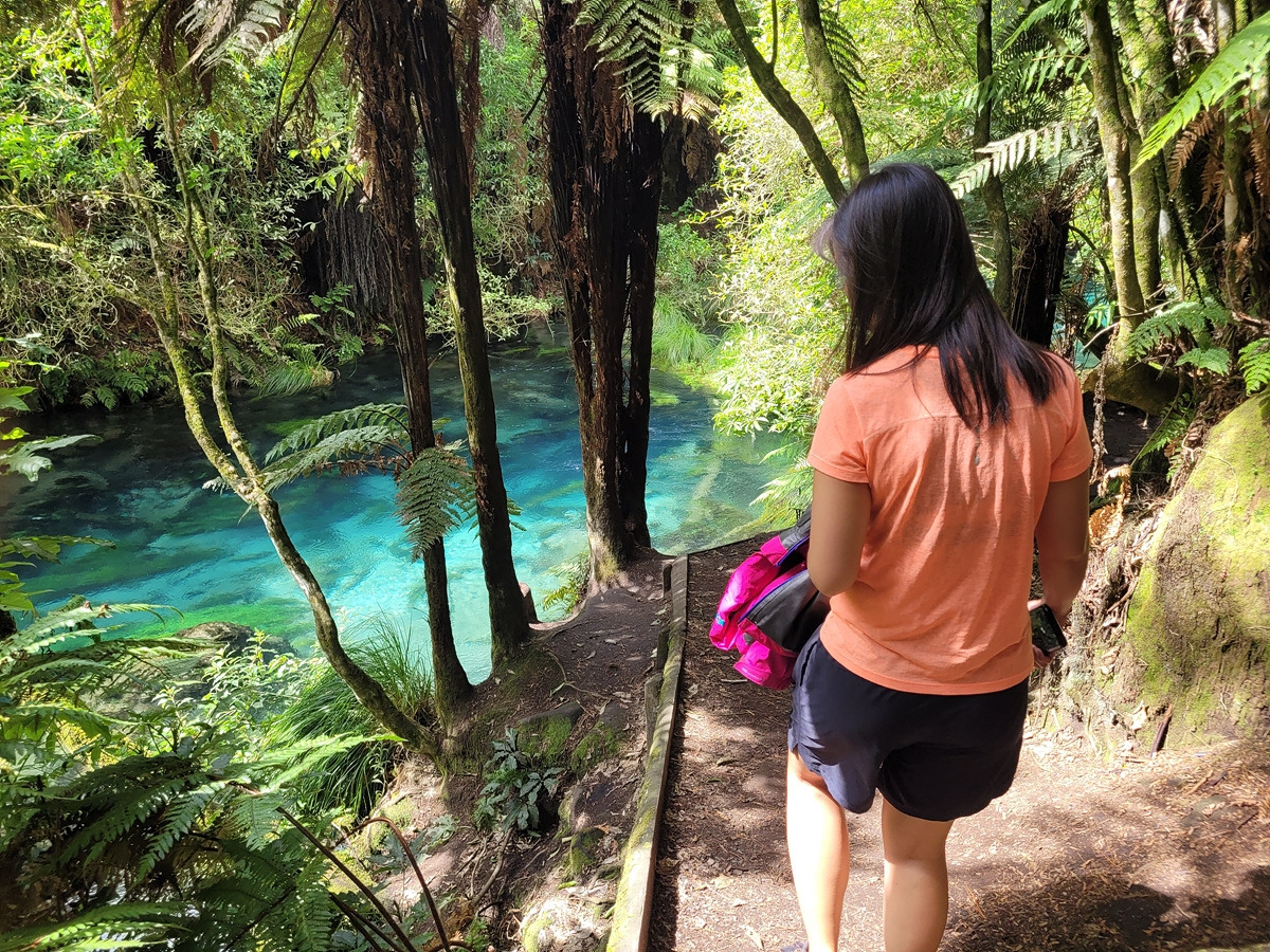블루 스프링은 테 와이호우(Te Waihou) 산책로를 따라가면 만날 수 있다. 입구에 관련 정보가 안내되어 있다. 목장 구역을 통과해야 하기 때문에 동물이 탈출하지 않도록 문이 있다.
