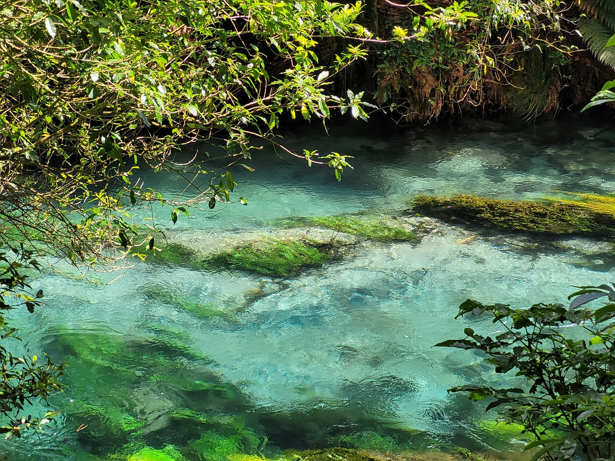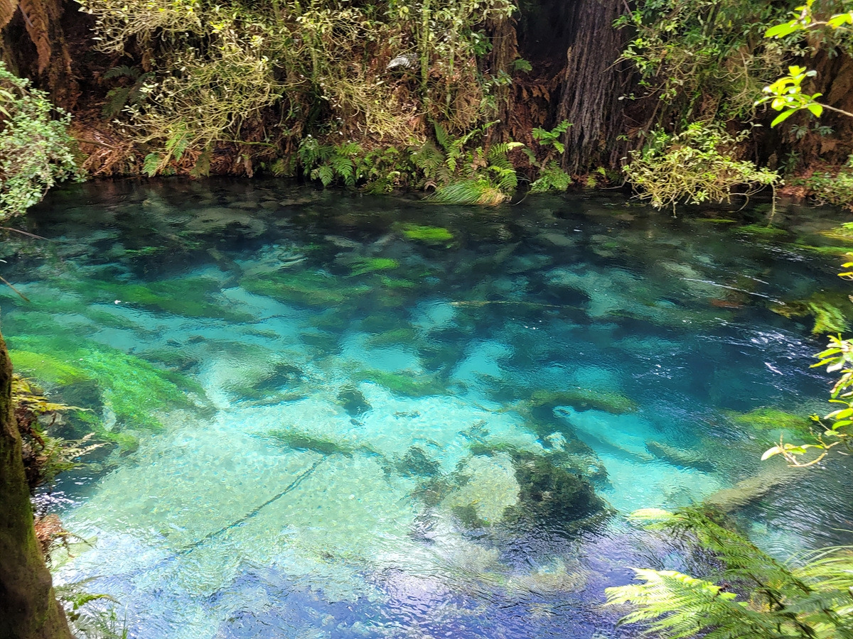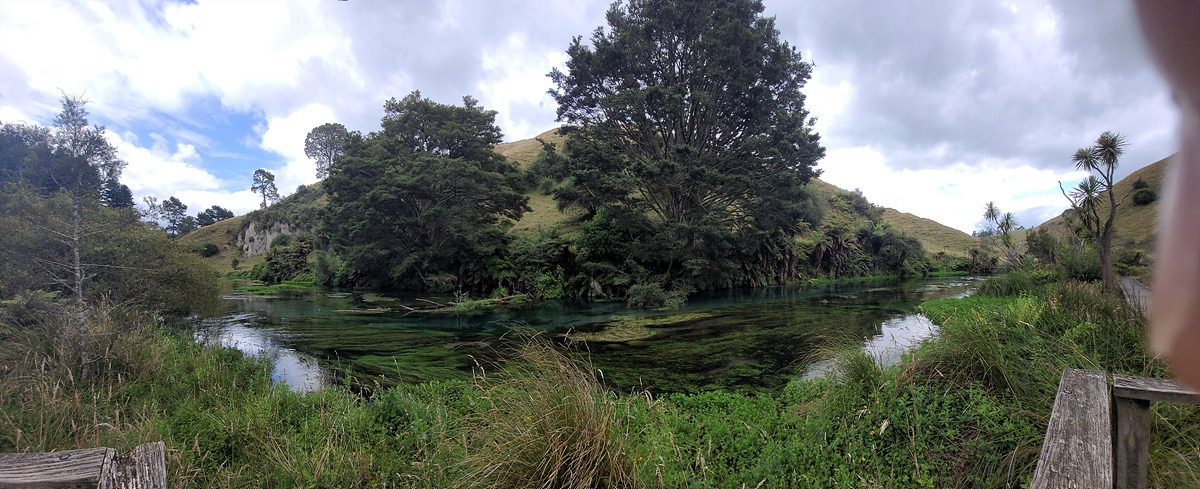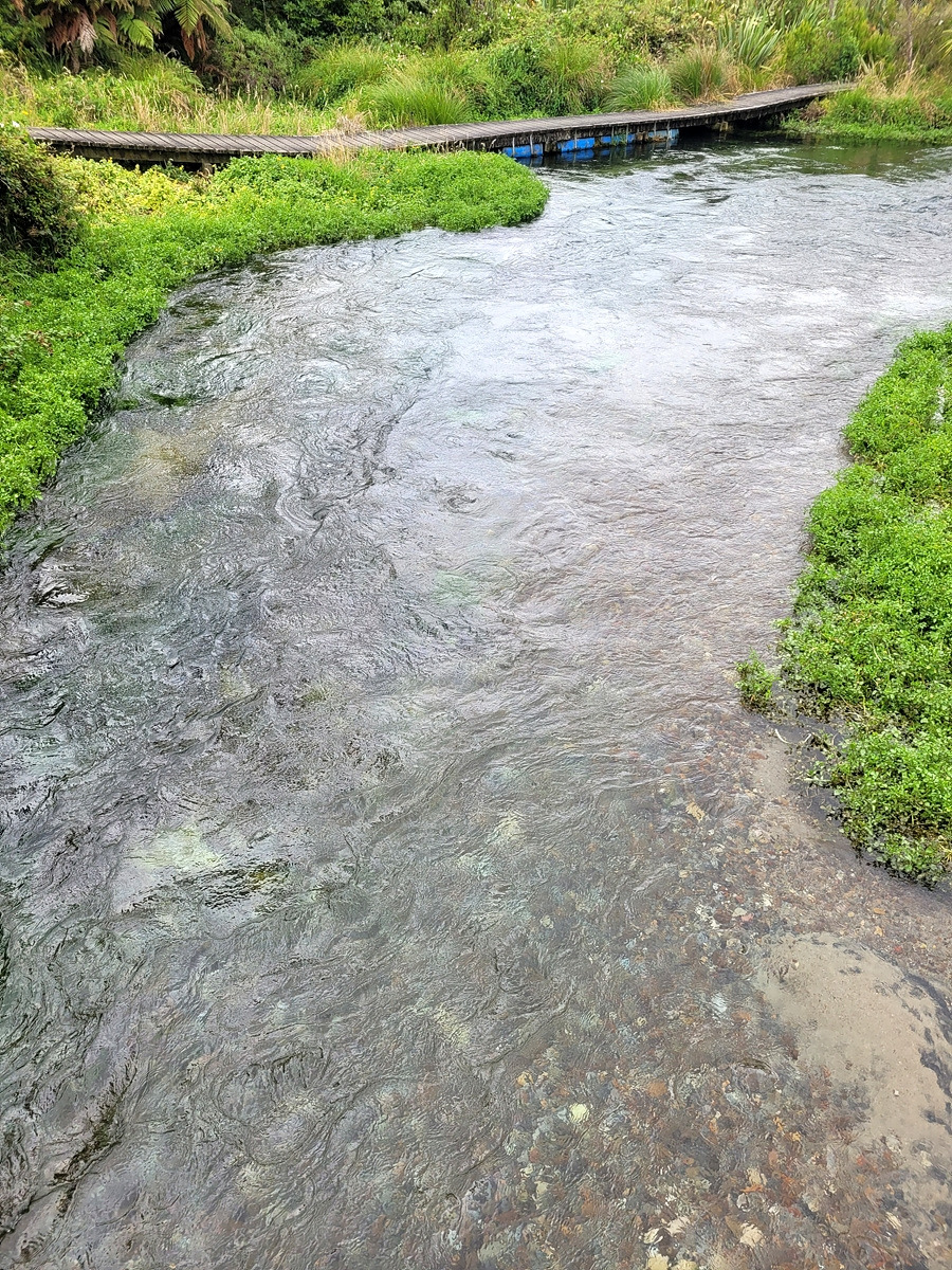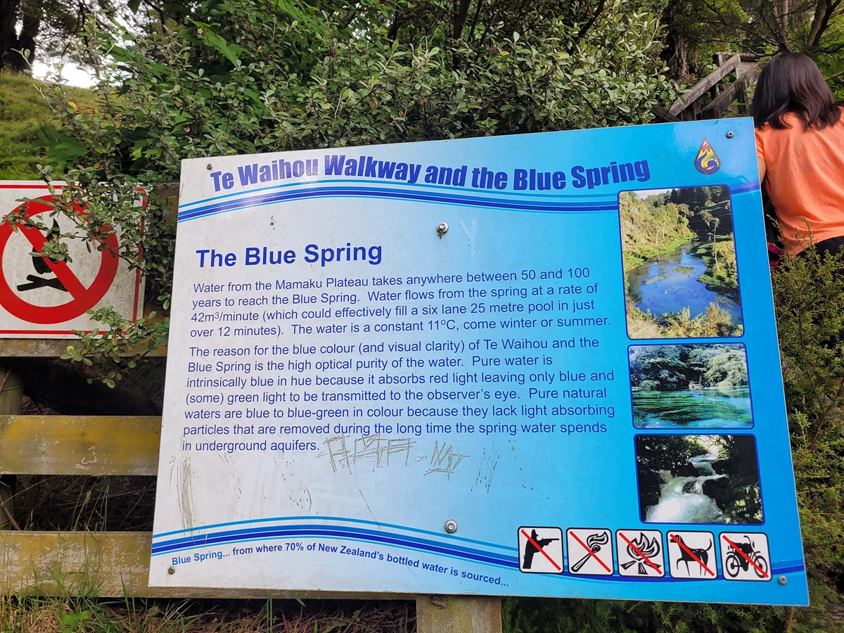 드디어 블루 스프링에 도착했다. 블루 스프링에 대한 안내판이 있다. 순수한 물은 푸른빛 외의 다른 파장은 흡수해서 푸른색으로 보인다고 한다. 맑고 배출량이 많아서 그런지 취수시설이 있다. 밑에 뉴질랜드 생수의 70%가 여기서 나온다고 쓰여 있다.