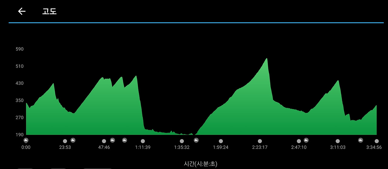 52km가 안 되니 거리는 짧지만 코스가 전반적으로 언덕길이 꽤 있다. 중간의 약한 내리막길이 낙동강을 따라 달리는 구간이고 가장 높은 곳이 청량산을 넘어가는 물의재다.