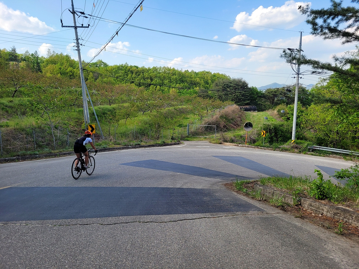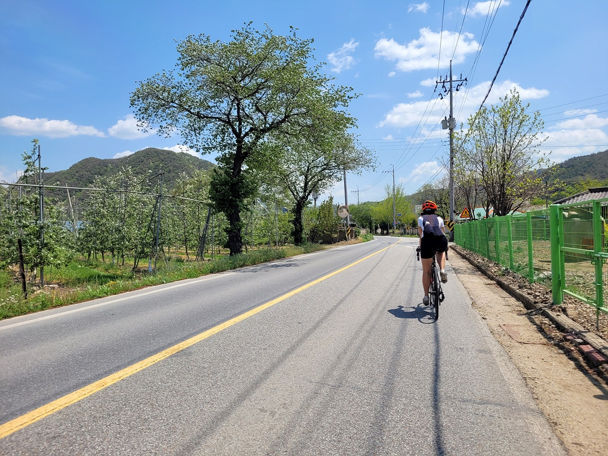 이제 사과나무 과수원 사이로 난 포장도로를 따라 쭉쭉 내려가서 908번 도로와 합류하면 된다.