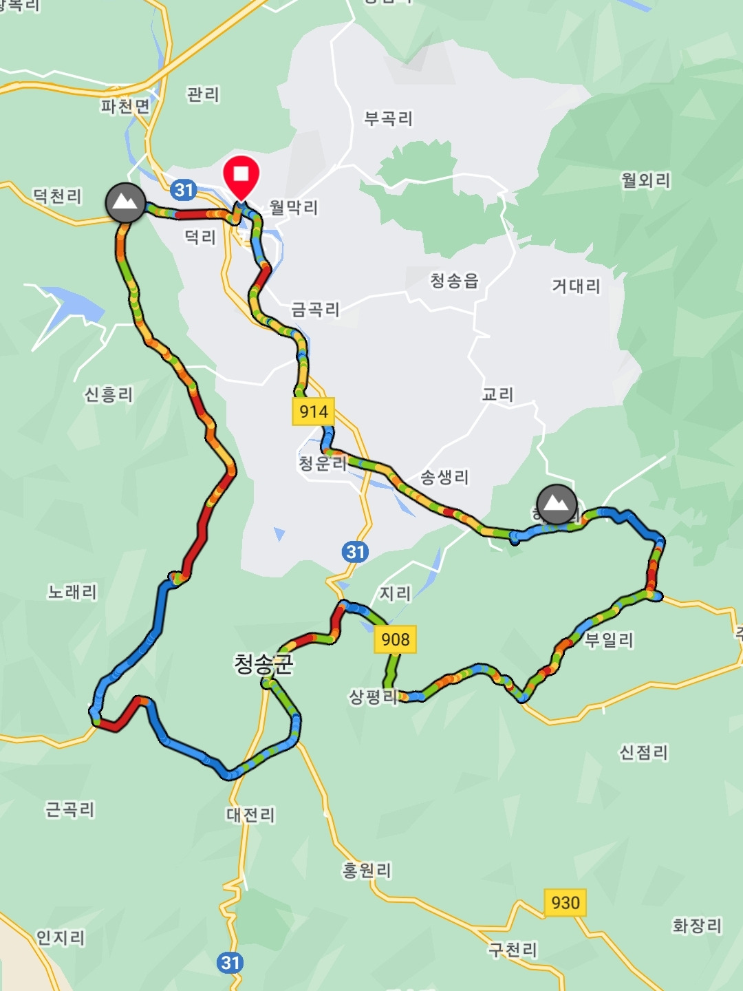 청송을 가볍게 한 바퀴 돌아보았다. 짧지만 언덕이 계속 있으니 운동이 충분히 되는 코스였다. 우리나라에서 가장 공기가 좋다는 지역에 날씨까지 좋으니 멋진 하루가 된 것 같다.