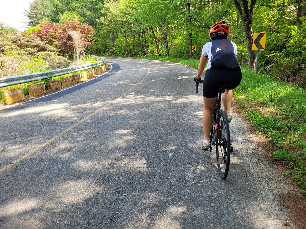 얼마 달리지도 않고 점심을 먹었더니 배부른 상태에서 오르막길을 올라가게 된다. 그나마 나무그늘이 드리우는 방향이라 덥지는 않다.