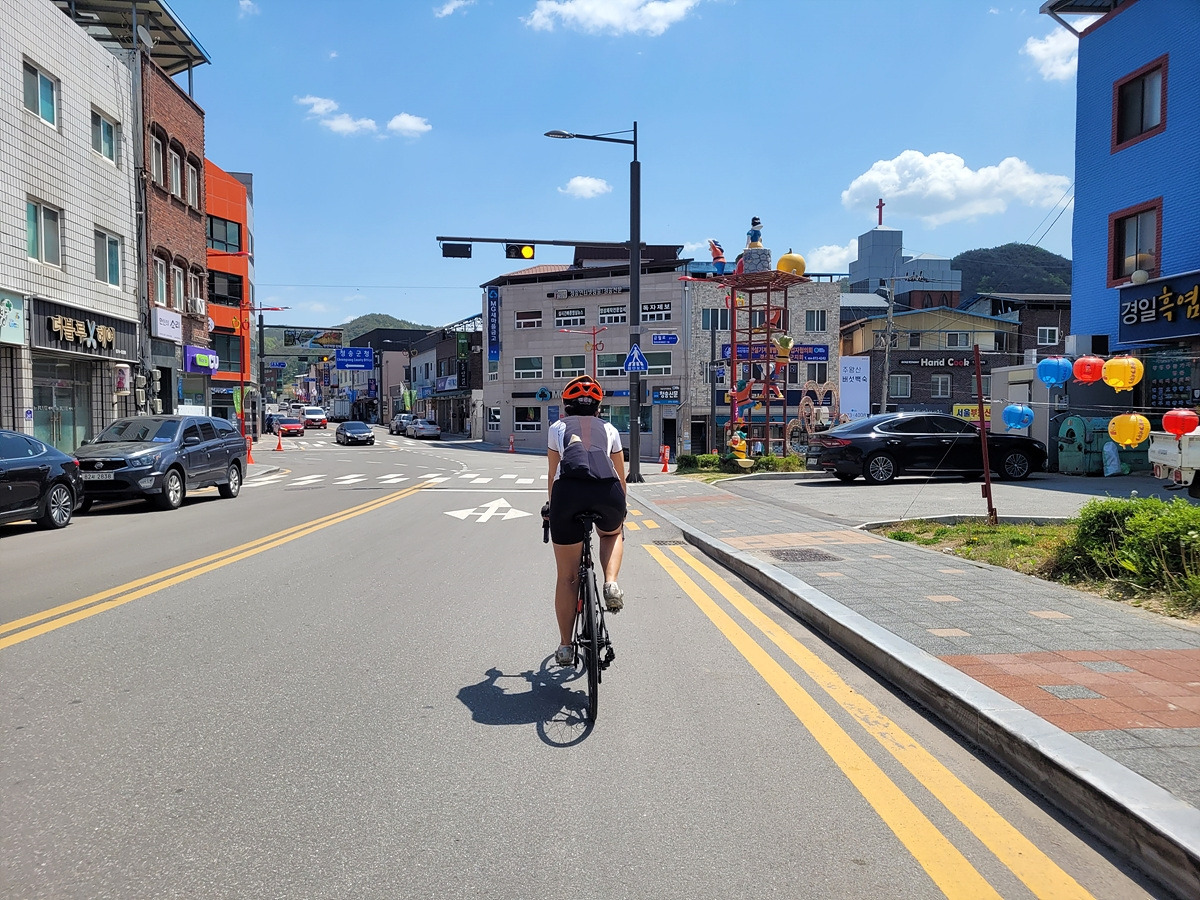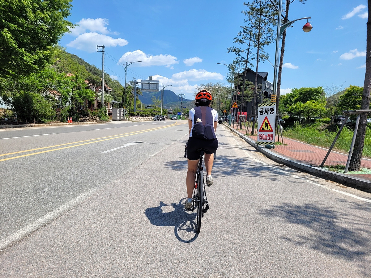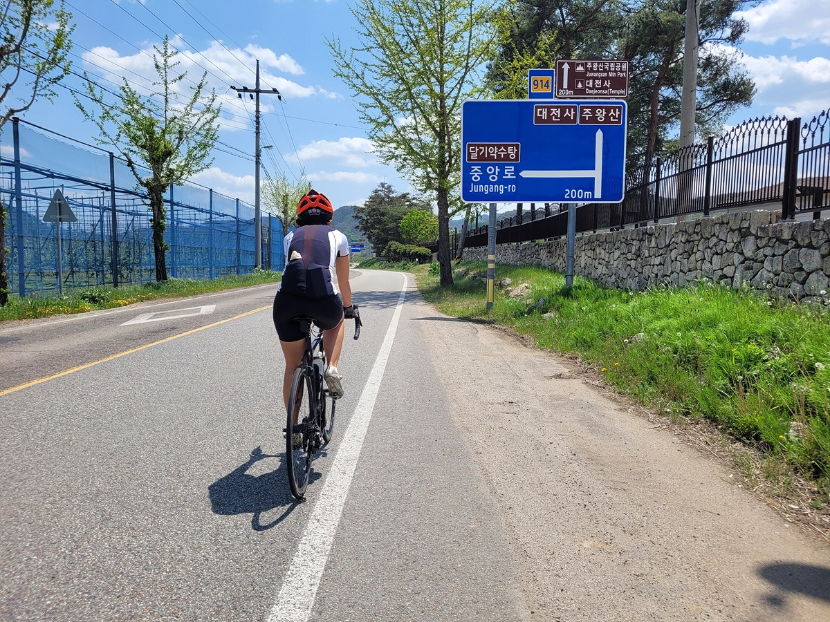 배도 든든히 채웠으니 다시 출발한다. 국립공원에 걸맞게 도로를 확장하려 하는지 주왕산 국립공원 입구는 공사 중이다. 공사 중이라도 자전거가 다니는 데에는 크게 불편하지 않고 천변 자전거길로 도로를 피해서 달려도 된다.