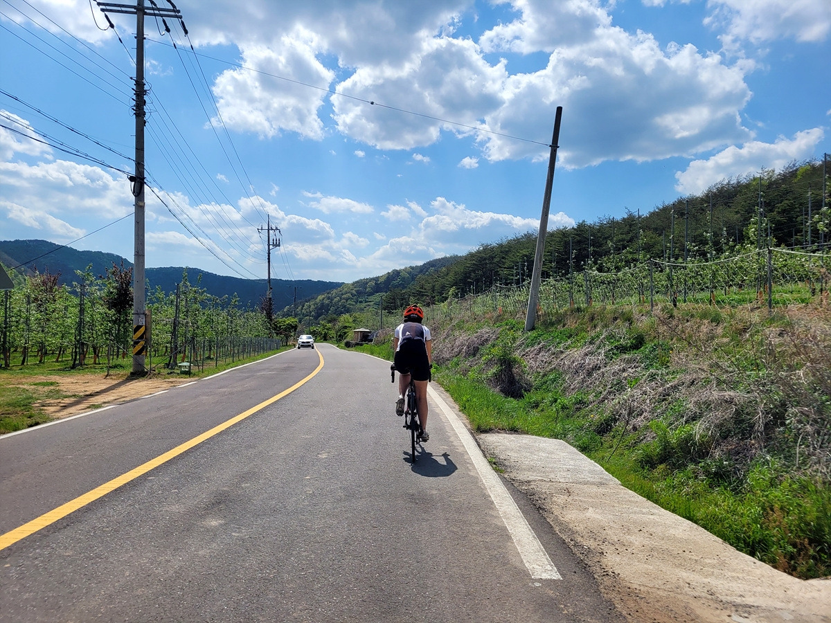 경북이 전체적으로 사과가 많이 나는데 여기 청송 주왕산 근처도 사과산지다. 사과 과수원을 따라 계속 달린다.