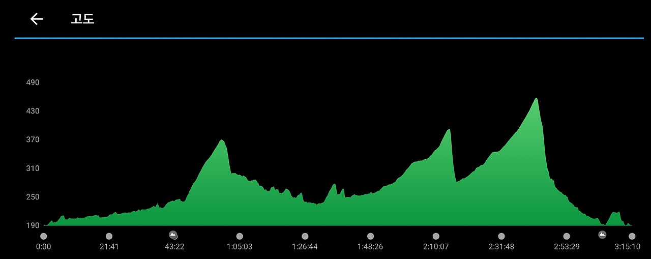 짧긴 하지만 아주 쉬운 코스는 아니다. 운동할만한 오르막길이 셋이나 있다. 그 중에 가장 높은 곳은 해발 헤발 458 m인 솔치재다.