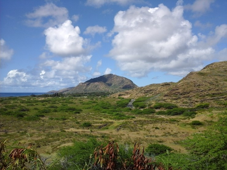 들판 사이의 비포장 길은 등산 후 스노클링 하러 갈 펠레의 의자에 가는 길이고 멀리 코코 헤드도 보