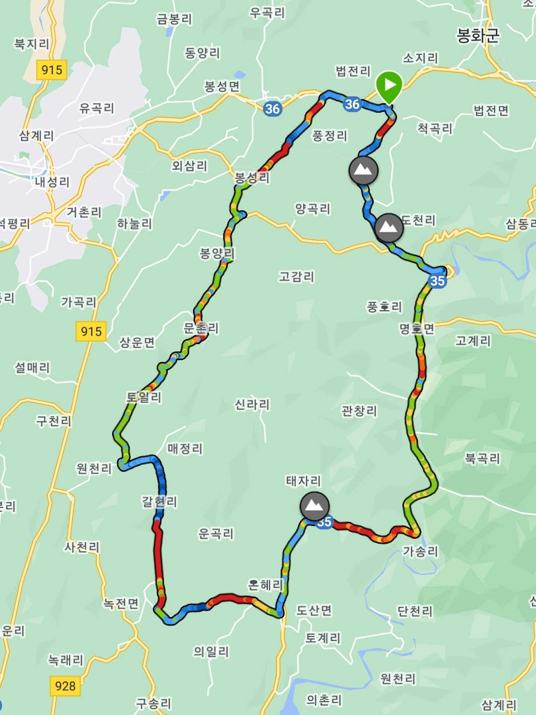 어제 동해시를 한 바퀴 돌고 왔으니 오늘은 다시 경북을 달려본다. 봉화군의 법전면에서 출발하는 60 km의 시골길 코스다. 법전은 36번 국도를 살짝 빗겨 있기에 자동차로 다니면 마을 자체에 들를 일이 없지만 자전거로 다닐 때는 법전 구간의 국도에 샛길이 없으니 들르게 되는 마을이다. 오늘은 법전면에서 출발해서 36번 국도 옆 샛길과 지방도를 이용해서 느긋하게 달려본다.